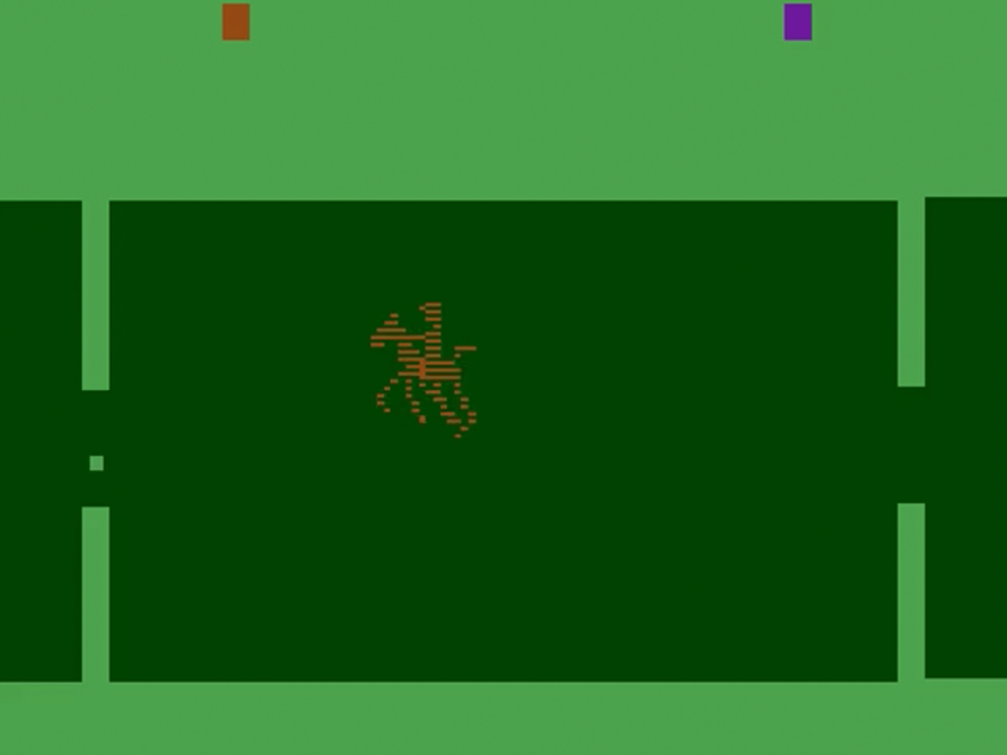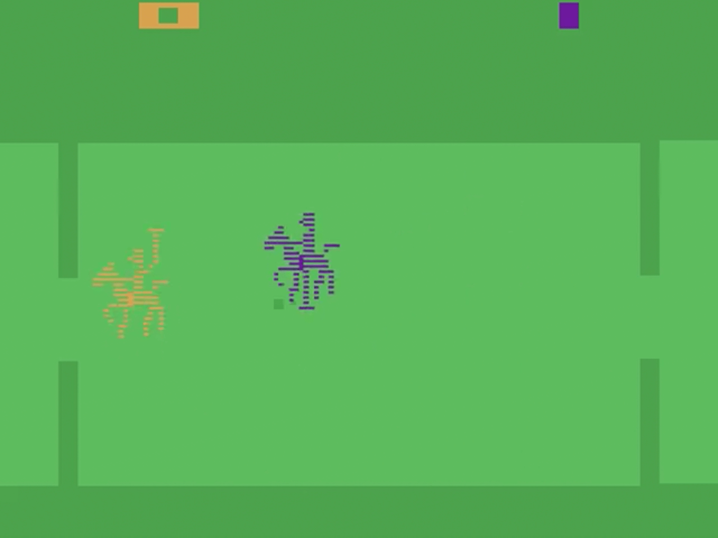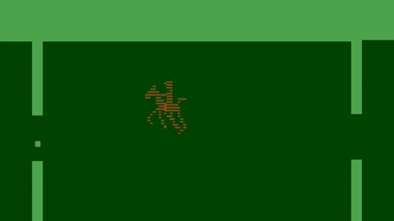 This is a game of polo, played on horseback. You move your horse with the joystick. The mallet swings automatically and will always send the ball in the direction of the opposing goal. The object is simply to to get the ball through the opposing player's goal more than they get the ball through yours. Some game variations have the ball wrap around the screen, some make the ball bounce off the sides, some give each player one horse to control, some two apiece. In 1978 Warner Communications, who happened to own both Atari and Ralph Lauren, assigned Carol Shaw to design a game that would tie-in with Ralph Lauren's new cologne "Polo". It's unknown exactly how the game would be used in the promotion, but it may have been intended to be given away to customers who spent large amounts of money. Supposedly several prototypes and handwritten instructions were sent to Bloomingdale's in New York, but nothing became of the promotion and Polo went unreleased until 2002. The cart, box and manual are reproductions from 2002 with permission of programmer Carol Shaw.