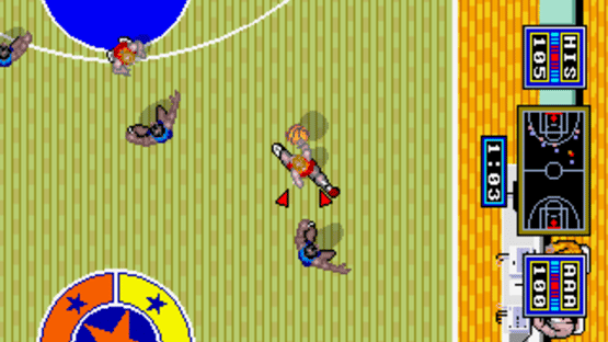 A four-player basketball game that is played from a bird's eye view of the court. The game can be played as one person versus the computer, two players either competing or cooperating, or three or four players with two players per team.