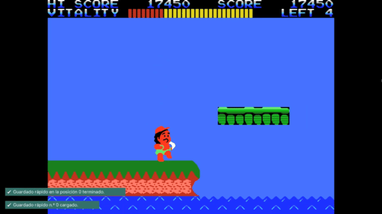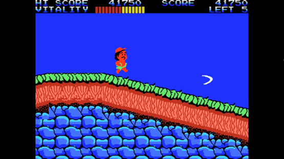 In the South Pacific, Master Higgins lives peacefully wearing only a grass skirt and a cap. That is until the Evil Witch Doctor decides to capture the Princess Leilani and hold her as his own. It's up to Master Higgins to gather throwing axes, fireballs and skateboards in order to aid his noble quest. The game is a side scroller, Master Higgins moves across the screen from left to right and finds his power-ups in giant eggs. This includes a skateboard which results in a great speed enhancement - until Master Higgins gets hit and loses his power. If he is not on a skateboard a hit means instant death. Another game mechanic is starvation which gets indicated through a meter which steadily decreases. If it hits zero the hero dies and the only way to fill it up is by collecting food on the way. Bosses await him at the end of levels, all the way to the Evil Witch Doctor himself.