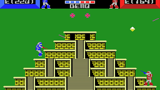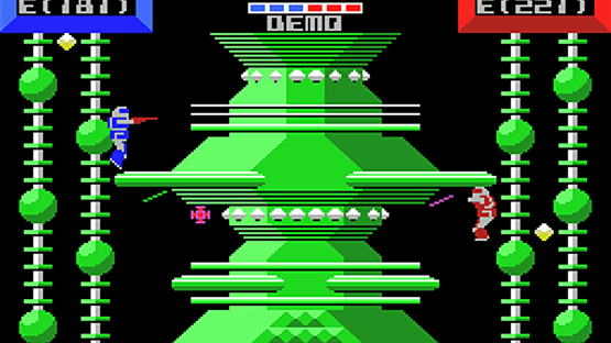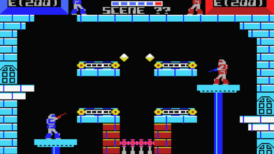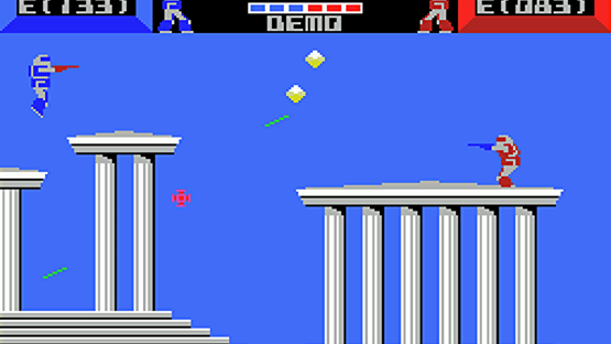 As the pilot of the United Nation's new FX1-BS weapon, you fall from the moon land land on Earth, now occupied by the Exoa aliens, and must defeat as many of their own warroids as possible. Warroid pits two players (or one player and the AI) against each other in a robot versus robot fight. Your goal: shoot the enemy until it has no energy left! Destroying the enemy warroid will give the victor one point on the six-point scale (players start out with three points each). Once all points are lit in the player's color, the player wins the game. Each warroid auto-aims their weapon fire, but kick attacks only work at close range. There are multiple platform-laden levels for players to fight in. You can also press the escape key to bring up a menu for setting handicaps and changing warroid colors. [Expanded from MobyGames]