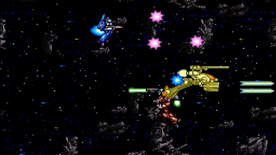 Choujikuu Yousai Macross: Scrambled Valkyrie is a 2D side-scrolling science fiction shooter. Aside from Hikaru, the player can also choose to play as Max or Milia. Each character has different types of power, range and weapon effect per VF-1 mode (Fighter, Gerwalk and Battroid). Power-ups obtained will increase weapon range and potency for up to three levels each.