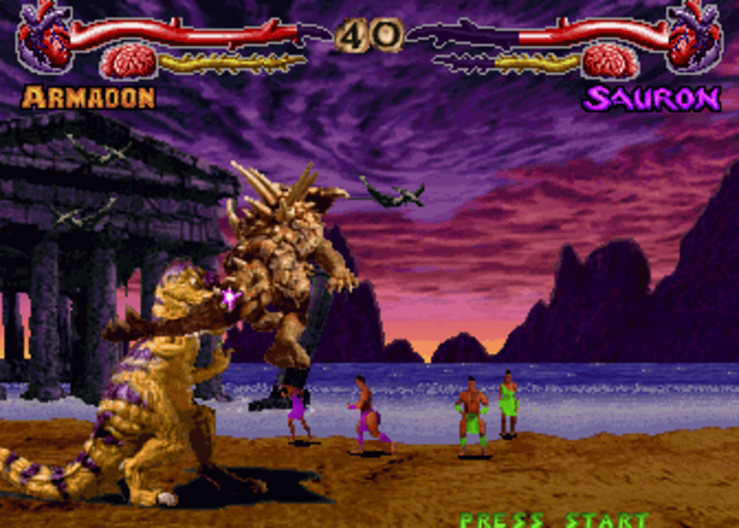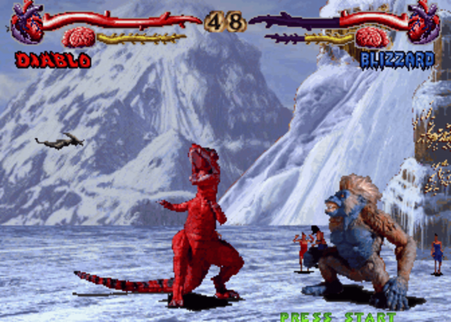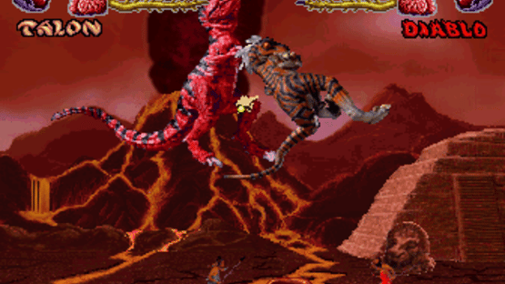 Primal Rage is a one-on-one fighting game featuring dinosaurs and giant apes as the fighters. The graphics are done with digitized stop-motion animation. Gameplay is similar to Mortal Kombat in that it is viewed from a side perspective, and features deadly finishing moves at the end of the match.