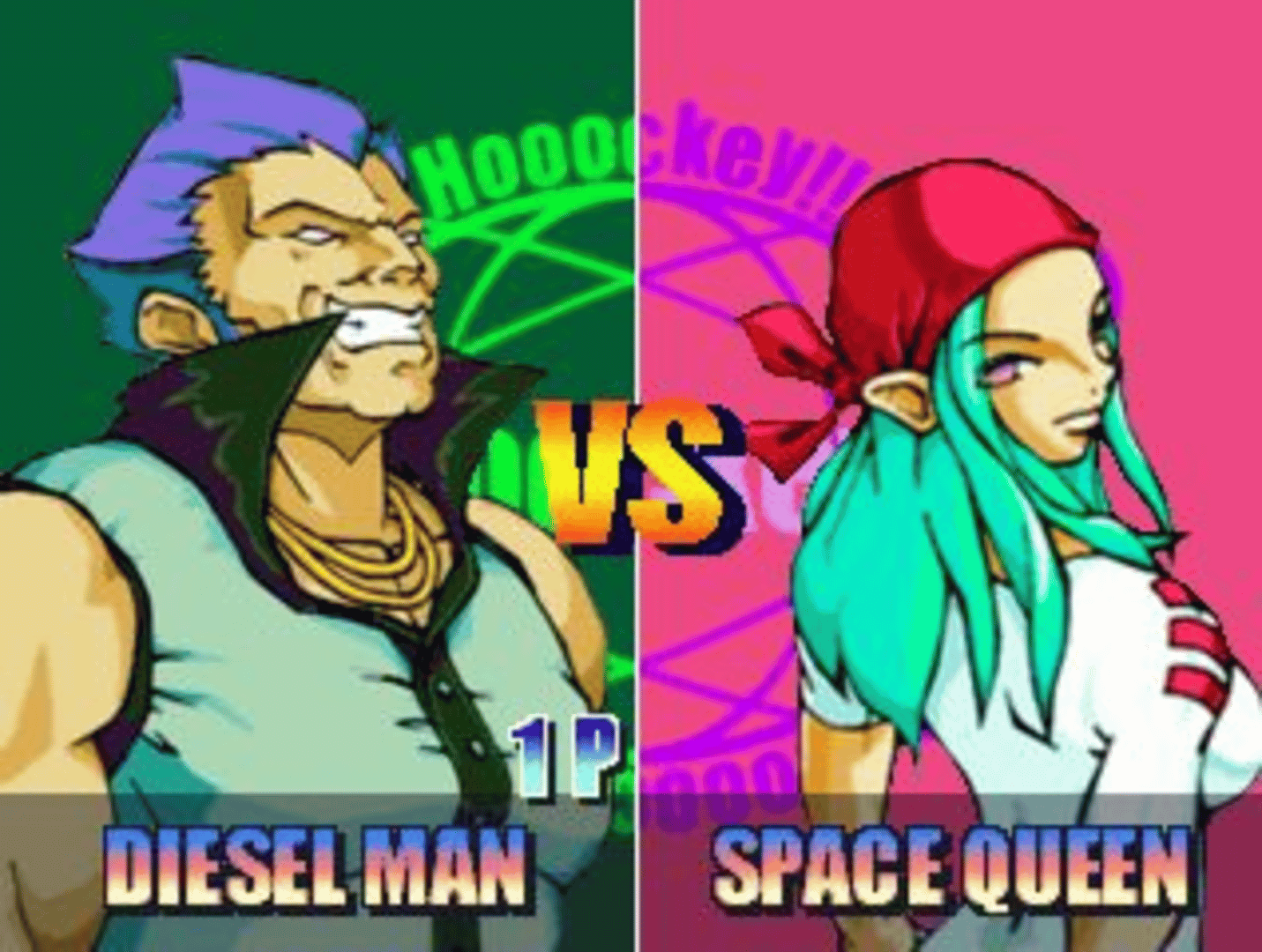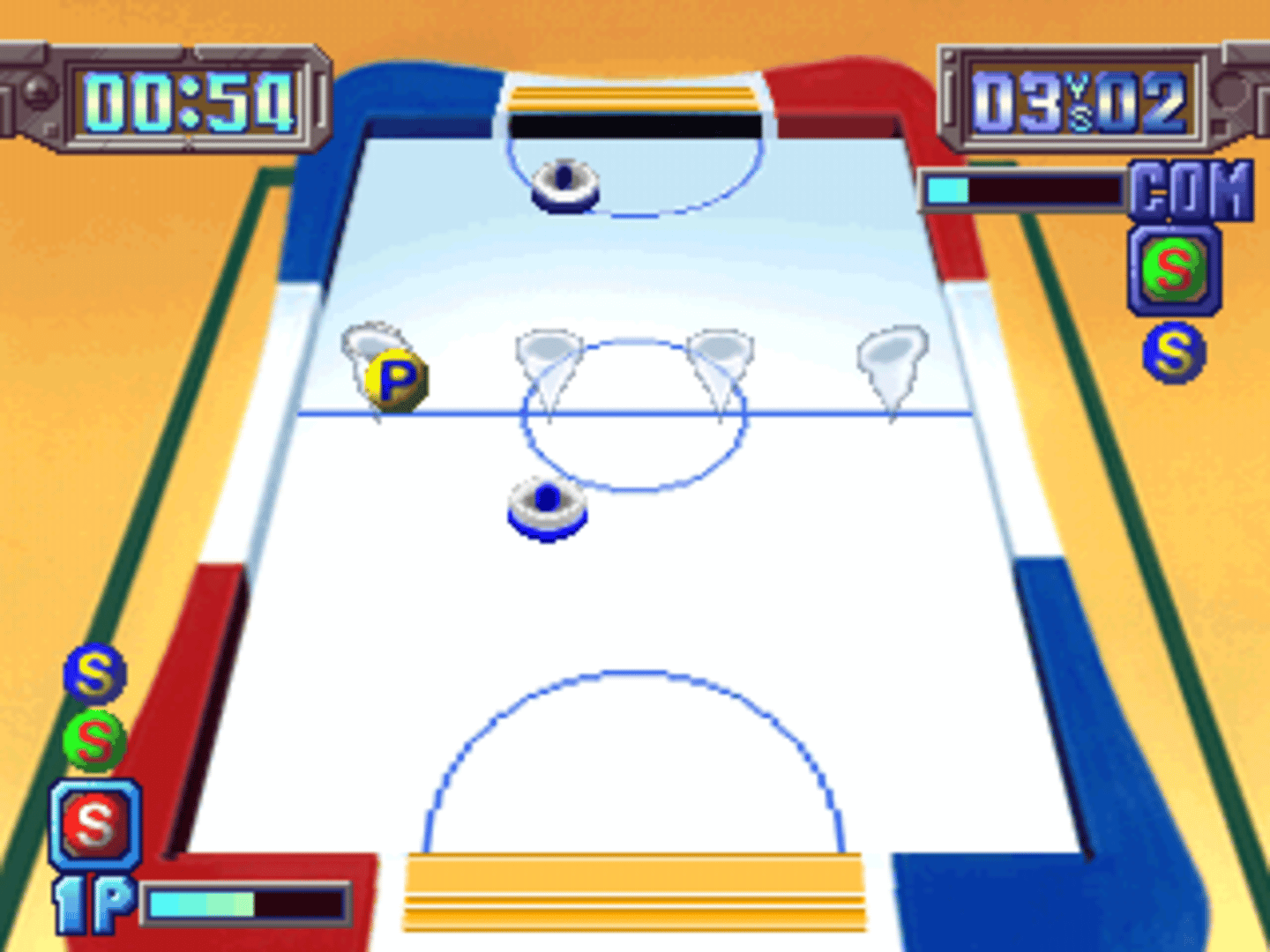 Air Hockey (Hooockey!! (SuperLite 1500 Series)) is a budget air hockey game for the PlayStation. There are four characters available to either play as or to face off against. The aim is to have a higher score than your opponent when the timer hits zero, and to make that a little easier there are bonuses strewn across the table. Some are activated upon touch, while others are stored with the player until used. The only two gameplay options are 1 player versus the computer or 2 players versus each other. Strange & futuristic hockey game with cartoon graphics.