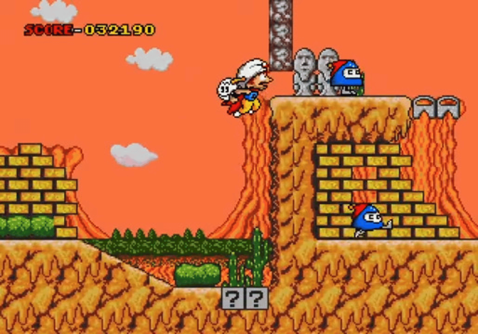Magical Hat no Buttobi Turbo! Daibouken is a game based on the japanese Studio Pierrot anime Magical Hat. It was later ported to the West in the form of Decap Attack.