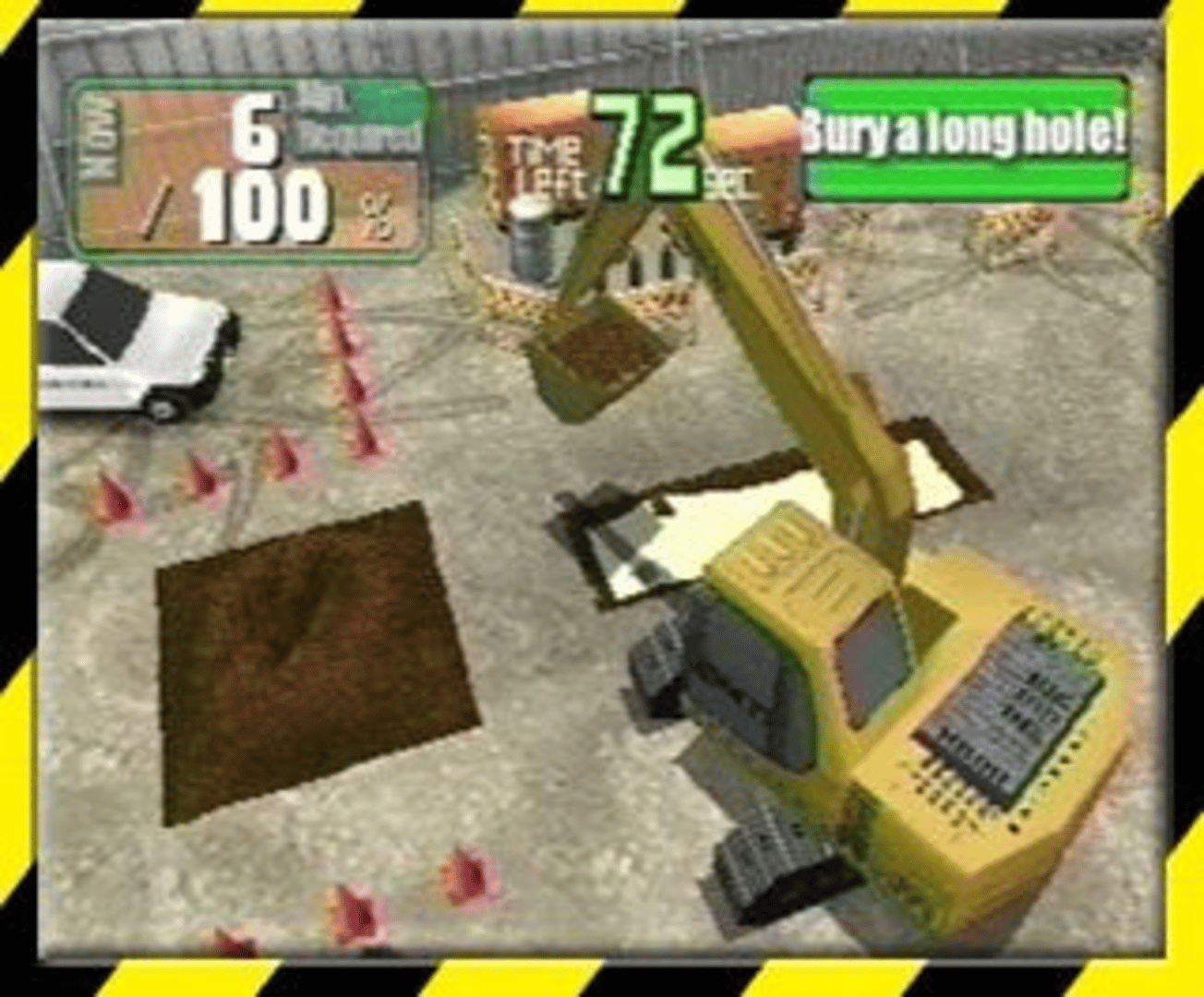 Based on Taito's Japanese arcade game, Power Shovel puts players behind the controls of three earthmovers in a variety of construction-oriented events. Three modes of gameplay are available: Arcade King, License Mode, and Level Editor. Arcade King includes missions from the coin-op, such as demolishing a car, knocking over houses, and pouring large amounts of curry sauce over rice. Money earned in this mode is used to unlock more mini-games, artwork, music, and other items. Two players can also compete against each other in these events in a best of three competition. Players take turns completing each task until a winner is declared. License Mode provides a series of timed tests (like knocking over poles, parking and digging sand) that must be completed in order to gain your operator's license. The Level Editor lets players design their own courses on a 6 x 6 grid, with obstacles such as holes, electric fences, cones, and sheds. The three available shovels vary in their size, speed, capacity, and digging ability. In each event, players have the option of a first- or third-person perspective.