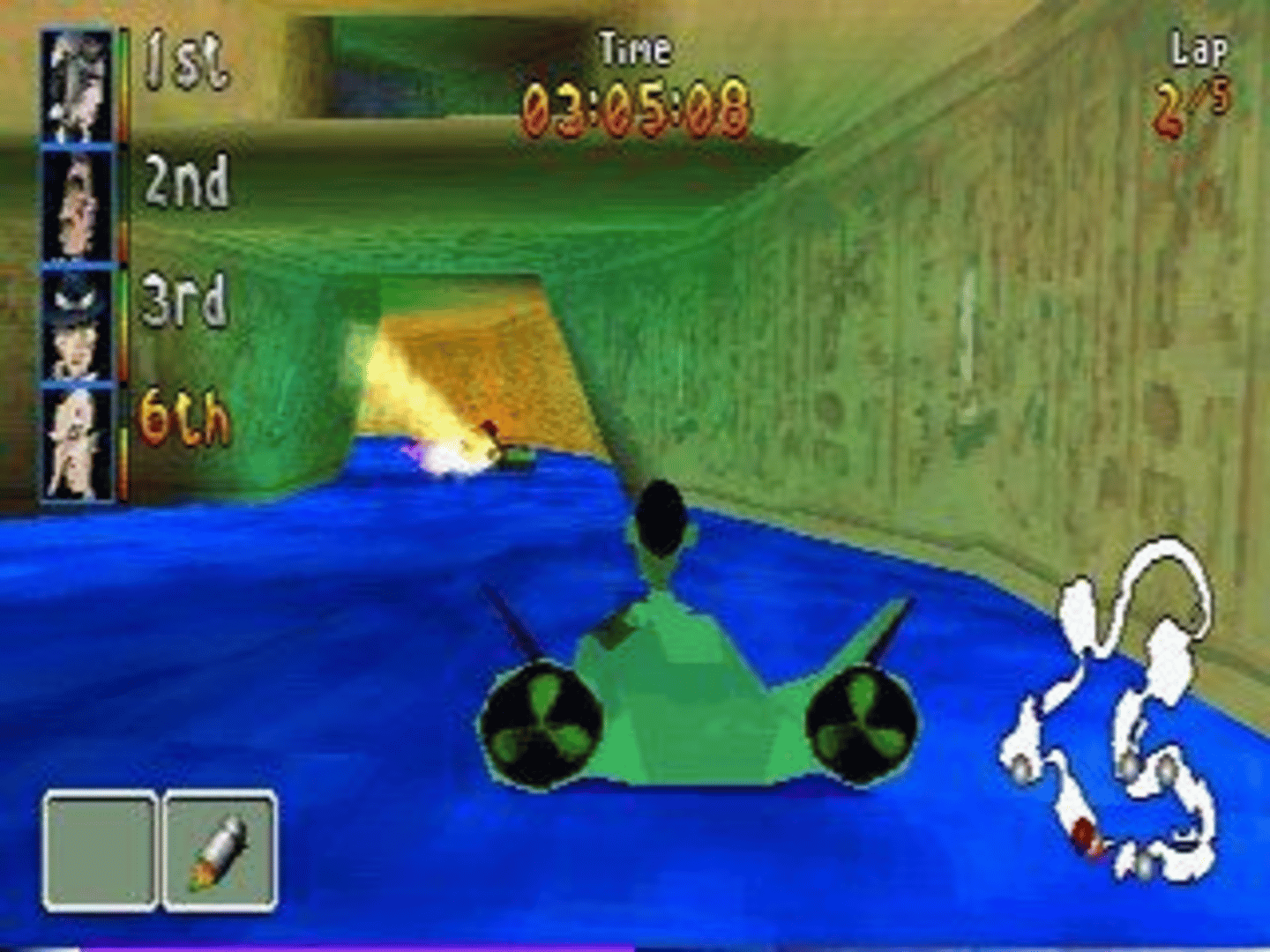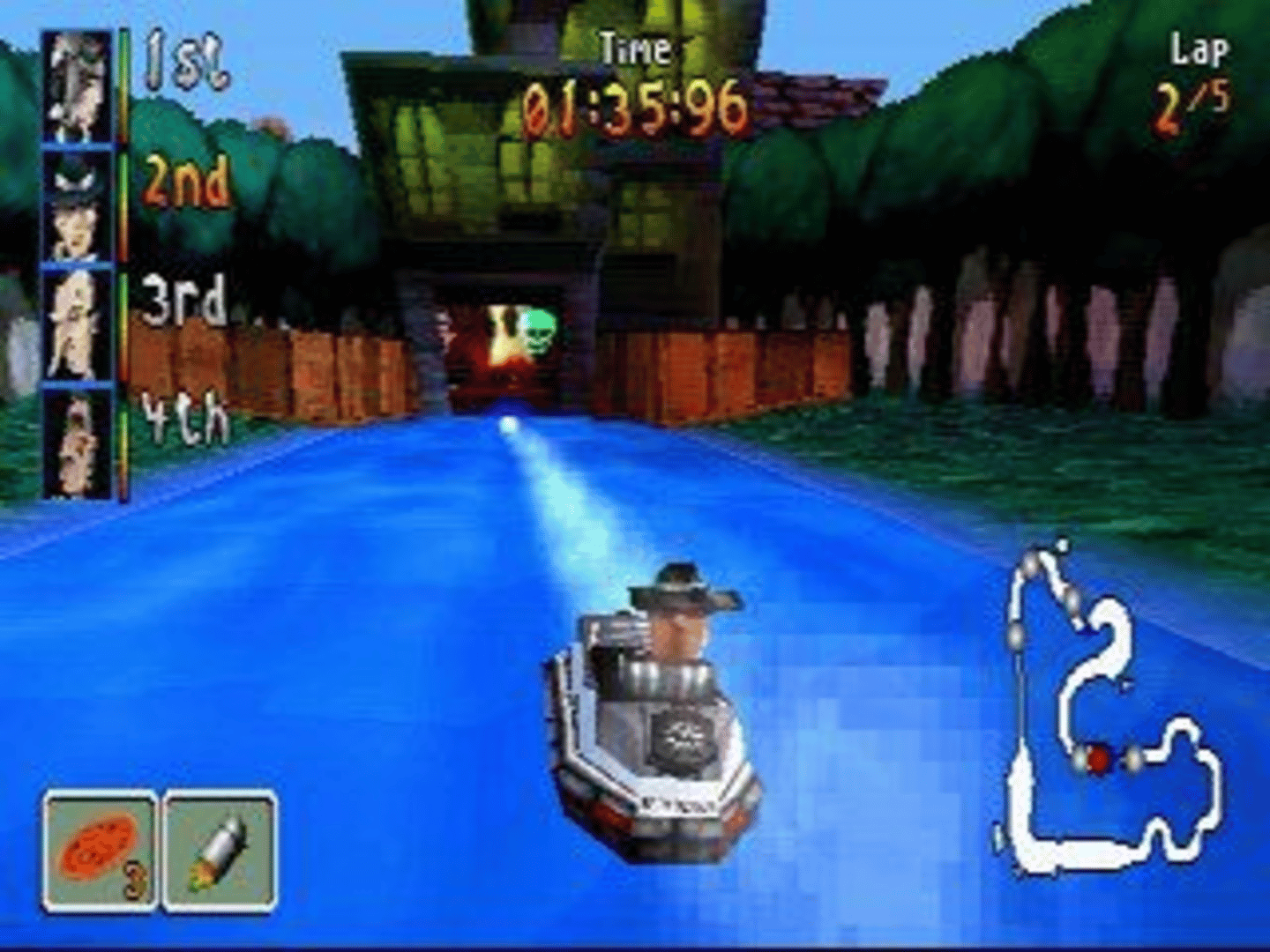 Renegade Racers, a watercraft racing game, has three game modes including arcade, quick race and high score. The modes are further broken down into eight race modes of varying types. In Battle Race, you blast opponents during the race while Check Point Challenge requires reaching checkpoints within pre-set parameters. Other self-explanatory races include Smash & Grab, Treasure Hunt, Head-to-Head and Dodgems. Rounding out the modes are the precision events Air Time and Drop Zone. The game features three difficulty choices, each with a different number of levels. At the easy setting there are 32 levels while the medium and hard settings have 40 and 48 levels respectively. In arcade mode, you must face increasingly difficult challenges as you complete the levels by meeting pre-determined times, tasks and finish-position parameters. As you complete various levels, a head-to-head challenge mode allows you to race against level bosses, unlocking the race for use in other play modes.