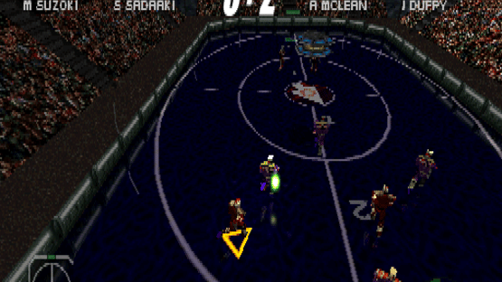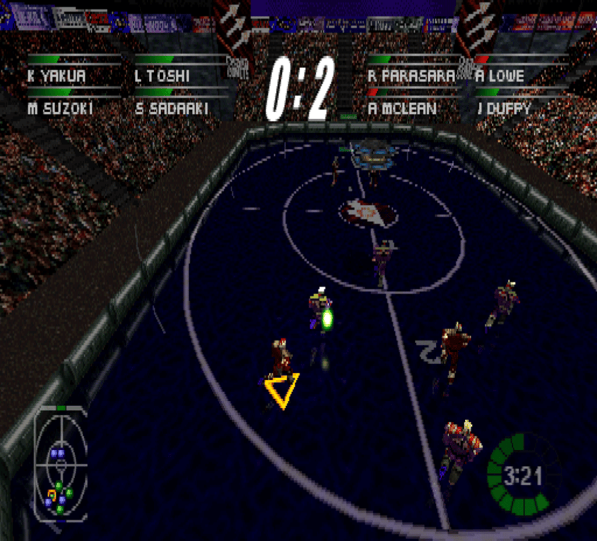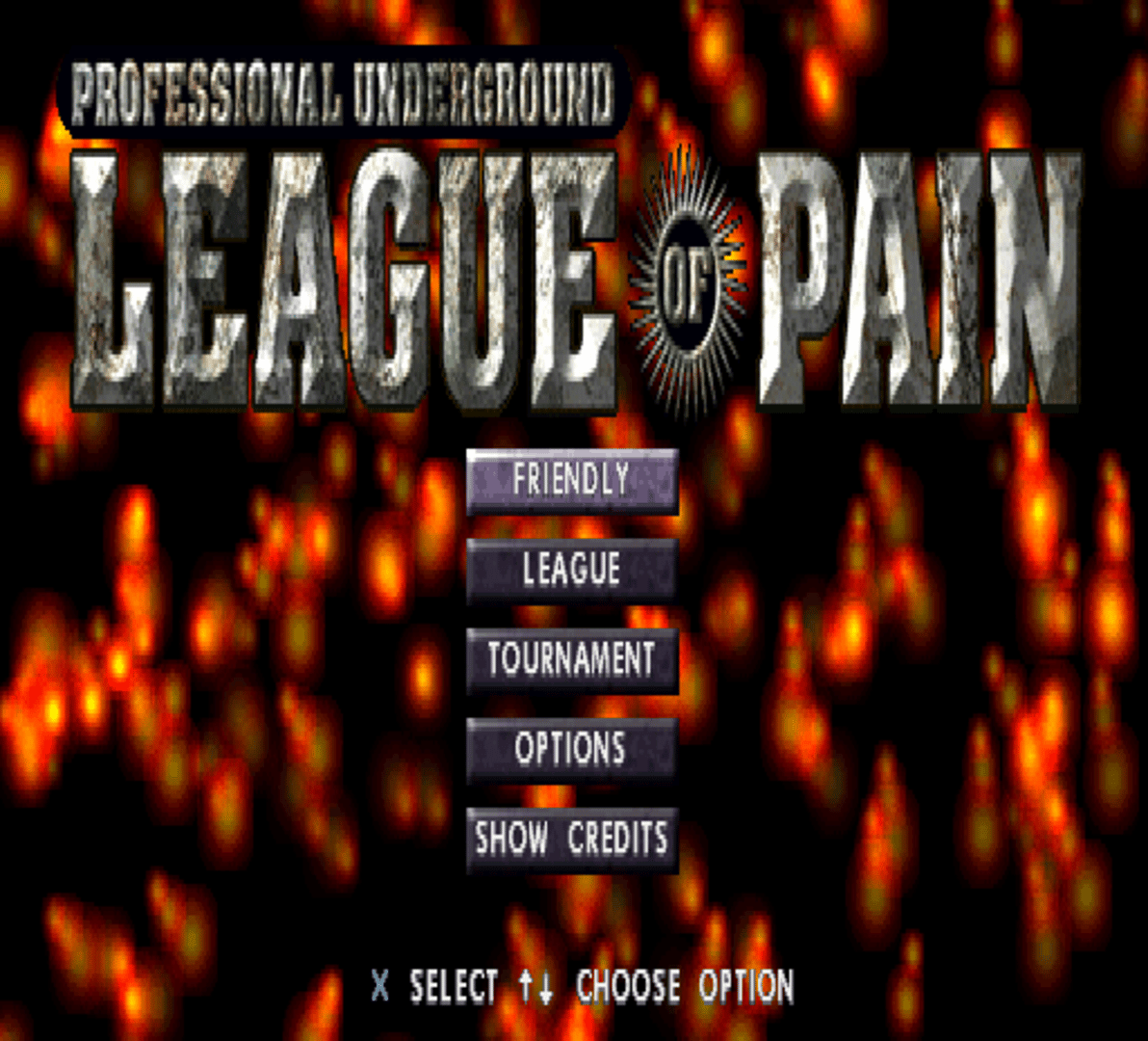 A combination of ice hockey, basketball, and bare-knuckle fighting, Professional Underground League of Pain is a futuristic sports game with few rules and loads of violence. The object of the game is to throw a plasma ball into a round goal that is suspended above the middle of a hockey-sized arena. Before you or your computer opponent can make a basket, the ball must be charged. Each team's charger is located in their opponents end of the court. Be careful, though: If the ball is charged with your opponent's color and you make a basket, your opponent gets the points. The same rule applies for the opposing team. There are different zones on the court and depending on where a player is standing when he makes a shot, he will score one, two, or three points. There are sixteen different teams to choose from, representing the countries of England, France, the United States, Germany, Japan, Mexico, Australia, and Russia. Each team has four players on the court at once. Most of the action consists of passing, shooting, and stealing the ball, punching and sliding into your opponents, and a whole lot of running.
