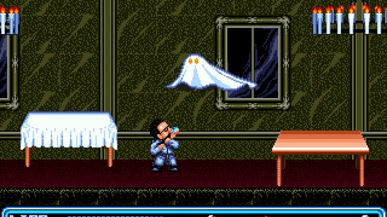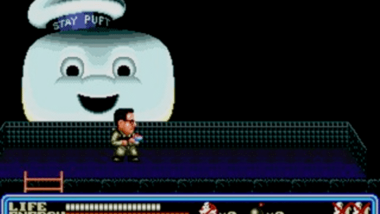 Ghostbusters was published by Sega and developed by Compile for the Mega Drive/Genesis on June 29, 1990. It is unrelated to the earlier Activision game (though their name still appears in the copyright screen), and is instead a run and gun game in which the player takes control of squat cartoon representations of three of the four Ghostbusters from the movie, with the noticeable absence of Winston Zeddemore. Four levels are available initially; after they are completed, a fifth level is unlocked, followed by a sixth and final level. Each level contains a number (usually two) of mid-bosses known as "middle ghosts"; after a middle ghost is defeated, it turns into a small green ghost which can be captured for extra money by luring it over a ghost trap. Between levels, money can be used to buy powerups, such as a 3-way shot or recovery items.