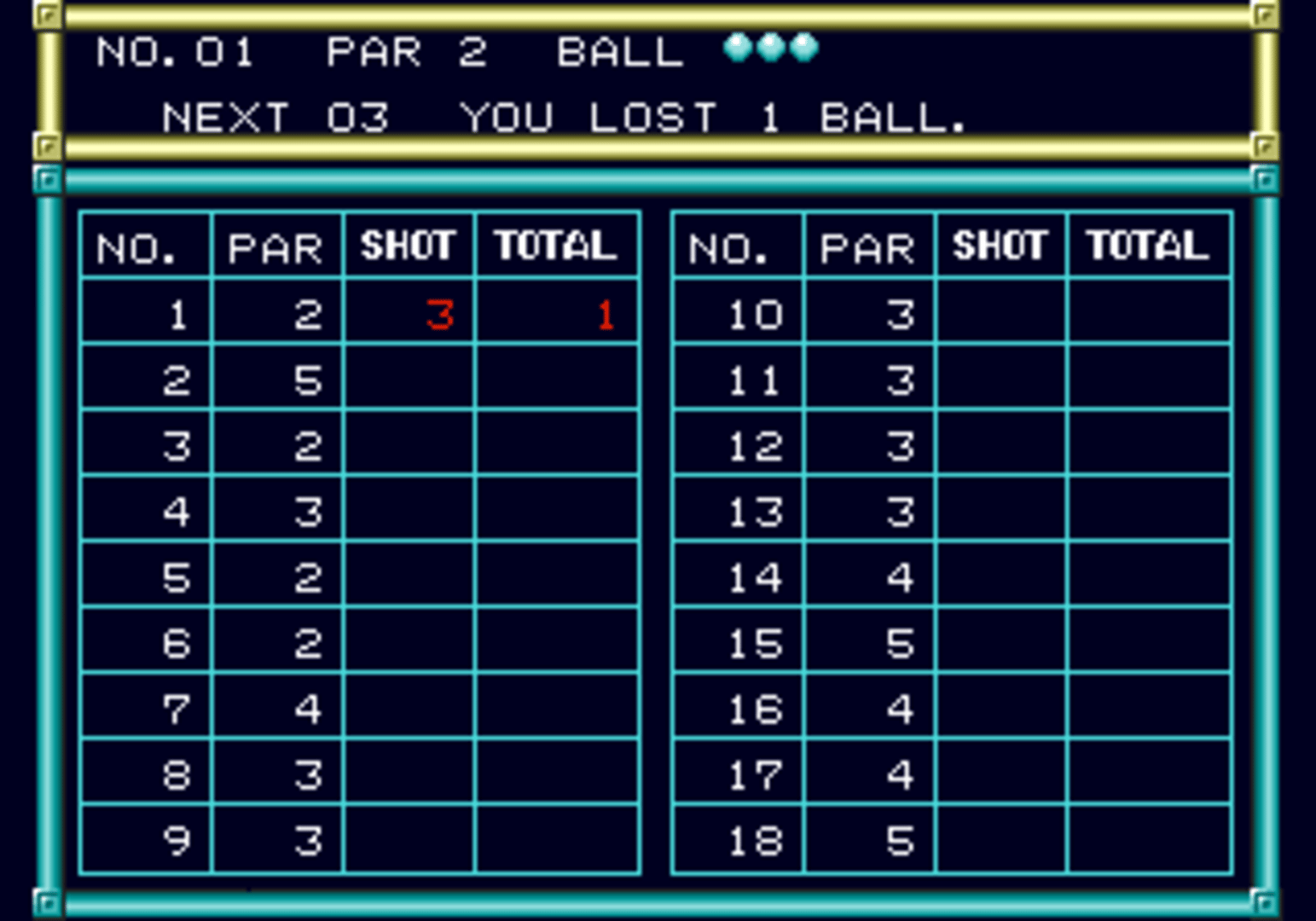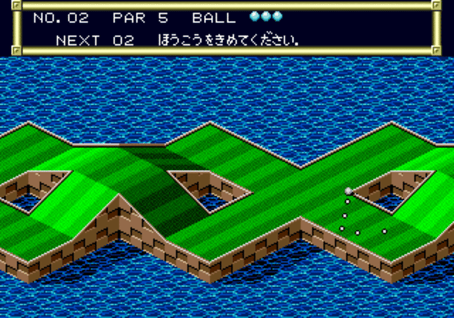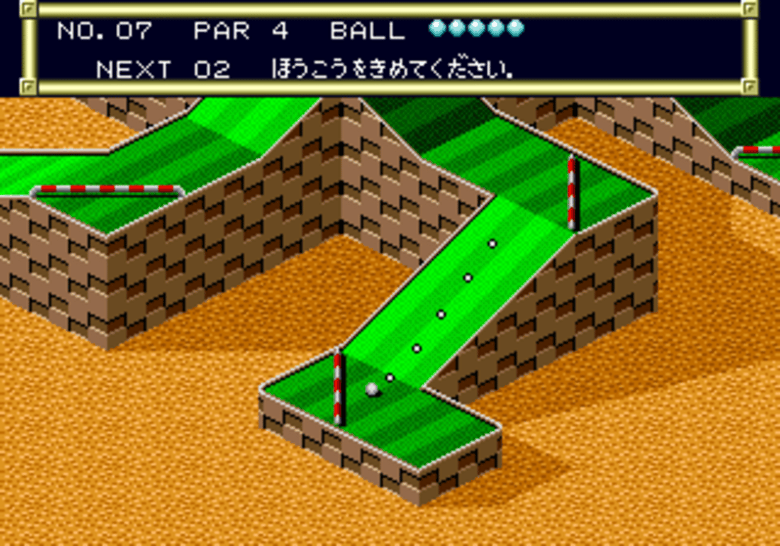 Putter Golf is a golf game developed and published by Sega for the Sega Mega Drive. It was only available in Japan as a download through the Sega Game Toshokan service. Putter Golf is essentially (but whether or not it officially is is unknown) a Mega Drive version of Putt & Putter: a very simple golf game with an isometric perspective. Rather than compete on wide open courts however, the game opts for much smaller levels which would only require a putter (much like minigolf). As well as this, there are a number of obstacles which can get in your way, from bumpers to lava.