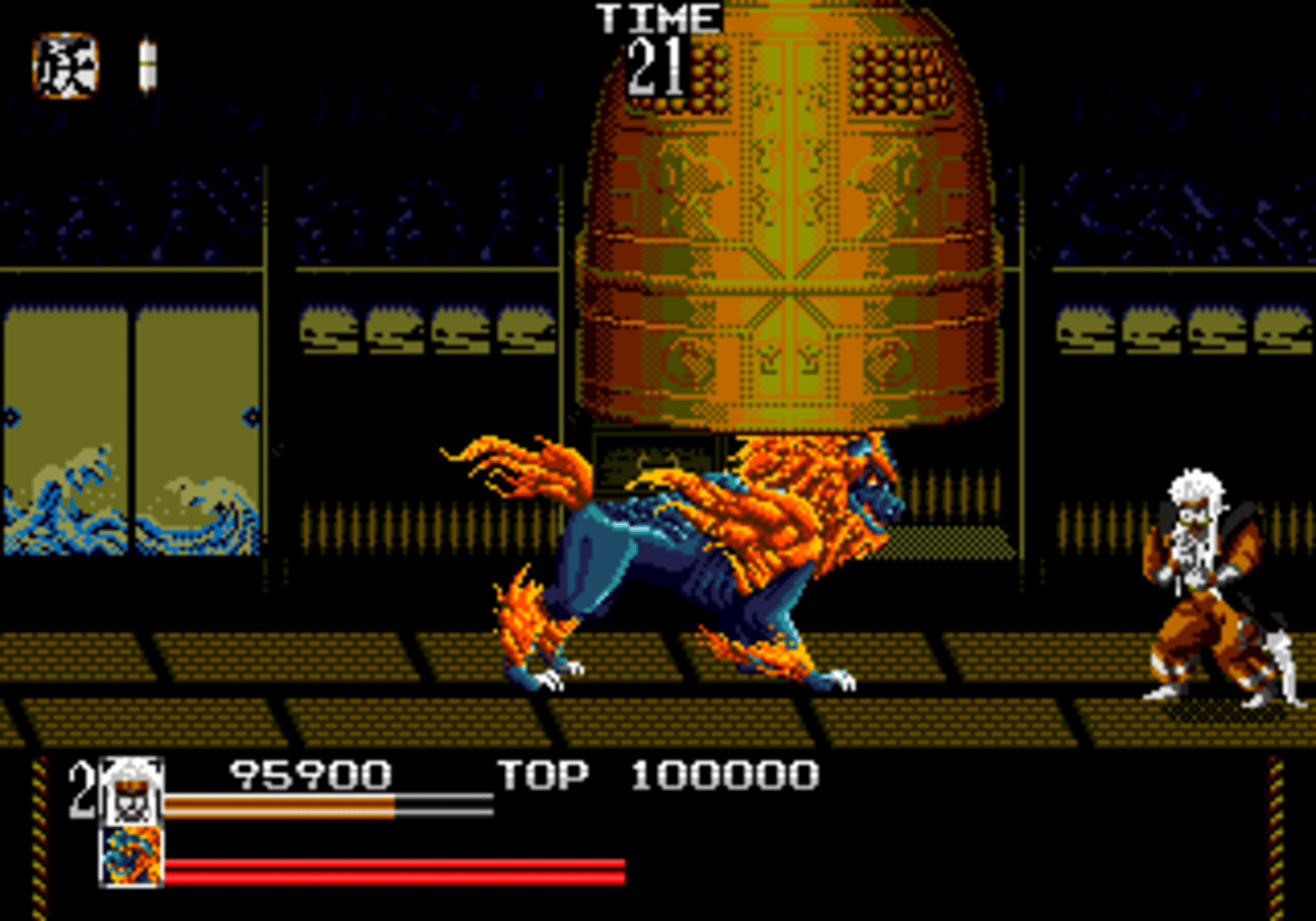 A kabuki warrior steps into a time portal to go back to the Shogun dynasty to defeat the evil lord Kabuki. The game is basically a side-scrolling beat-em up game, with the player controlling the kabuki warrior. The player can deliver kicks and punches to hordes of enemy minions throughout each stage. Other moves at the the players disposal are jump kicks, the ability to lift enemies and throw them, and the ability to grab enemies and spin them like a tornado. The player can also use a special magic power that gets charged by picking up scrolls throughout the level. The player can also find life bar refills throughout a stage also.
