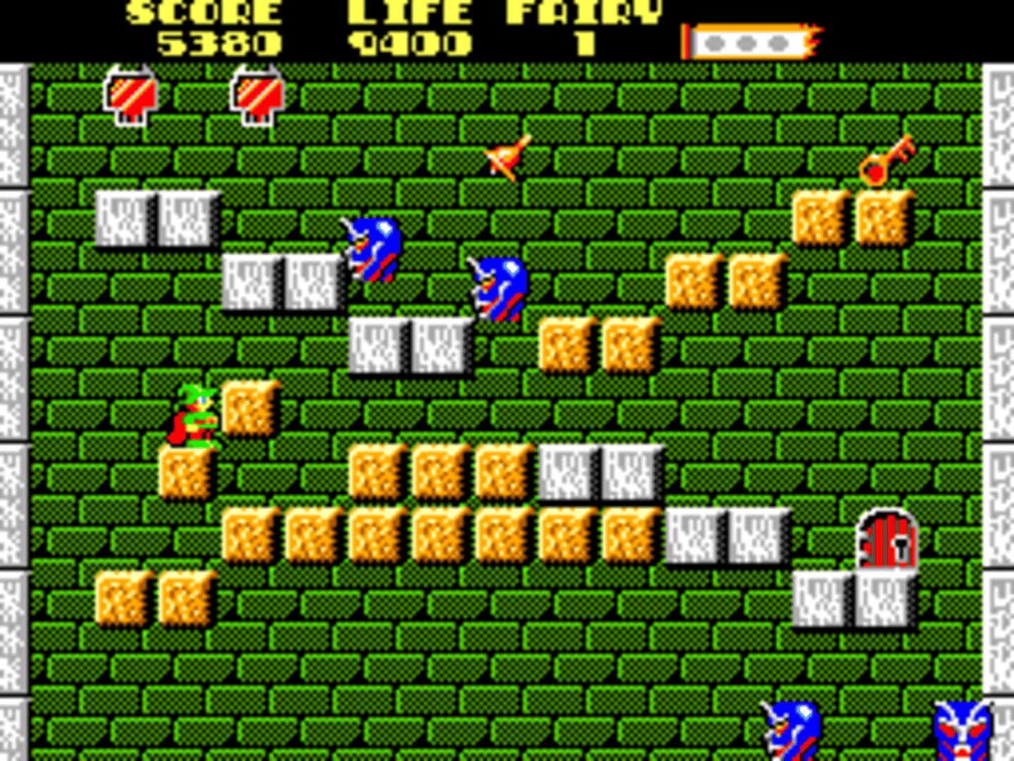 Solomon no Kagi: Oujo Rihita no Namida is a platform-puzzle arcade game developed by Tecmo, which was subsequently brought to the Sega Master System by Salio in 1988. The game was brought to the west via other platforms as Solomon's Key, though the Master System version remained exclusive to Japan. The object of the game is get a key and then make your way to the exit. To achieve this, Solomon can create and destroy blocks, which can be used to trap enemies or as platforms.