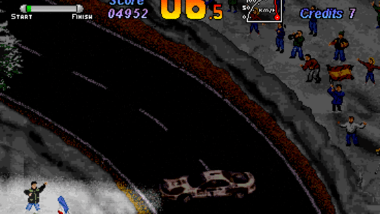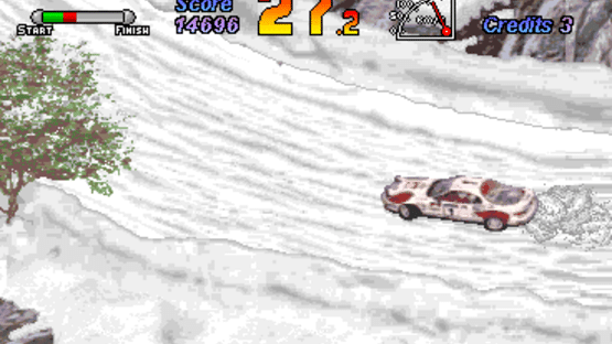 World Rally is a road rally-themed driving game. Licensed by Gaelco of Barcelona, Spain, it is suitable for both street and arcade locations. World Rally is a 1- or 2-player alternating driving game. Controls include a steering wheel on a mounting pod, a high/low gear shifter assembly, and an accelerator pedal. Players select 1 of 4 rallies to start, each progressively more difficult than the one before. A rally is composed of three stages, offering a variety of different track layouts and road surfaces. Asphalt, dirt, night driving and snow-covered roads require players to adjust their driving skills accordingly. Players maneuver their way through hairpin curves, jumps, bridges, puddles, and other obstacles. Completing each stage within the 60-second time limit allows players to advance to the next stage for free. After the finish of each stage, and at the completion of all 12 stages, players' times are displayed and compared with other top drivers. It became notable in recent years due to being extremely difficult to play on emulators like MAME, as the arcade hardware implemented an advanced anti-piracy system until Gaelco co-founder Javier Valero provided unencrypted keys for the PCB in 2008 at a Spanish gaming conference, allowing it to be emulated and played. Gaelco later made its ROM image available as freeware.