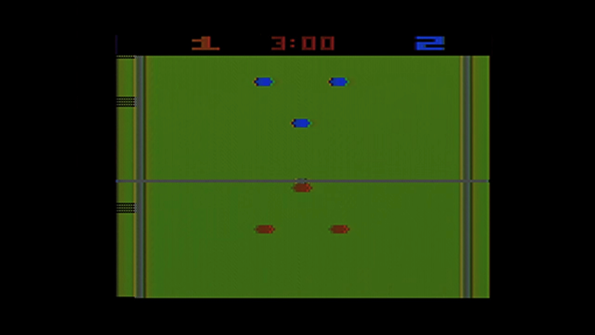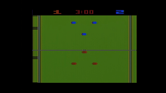 Championship Soccer is a soccer game where each team has one forward, two backs and a goalie. The forward and backs always run in formation. You only control the goalie when he has the ball, otherwise he is computer controlled.