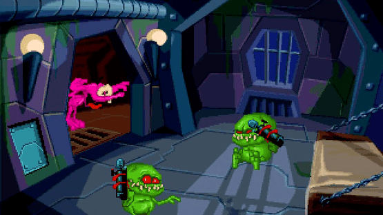 Chewy: Escape from F5 is an adventure game featuring Chewy, a pink alien protagonist. The plot revolves around Chewy and his partner Clint's mission to steal the powerful "Red Glum" from the Borkian high security zone F5, aiming to prevent its use by the Borks. After successfully obtaining the Red Glum, Clint's escape is interrupted when his spaceship is pulled into a wormhole, crash-landing on Earth. The game follows Chewy's journey as he navigates this unfamiliar planet, facing challenges and puzzles while attempting to reunite with Clint and protect the stolen Red Glum. Combining sci-fi elements, distinctive character design, and planet-based adventure, Chewy: Escape from F5 presents players with an engaging storyline and varied gameplay as they guide the alien through his Earth-bound mission.