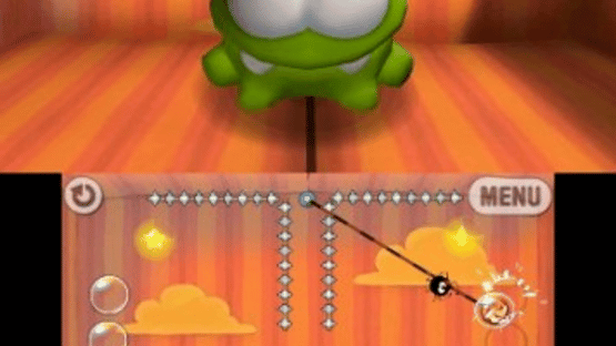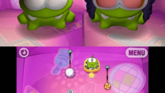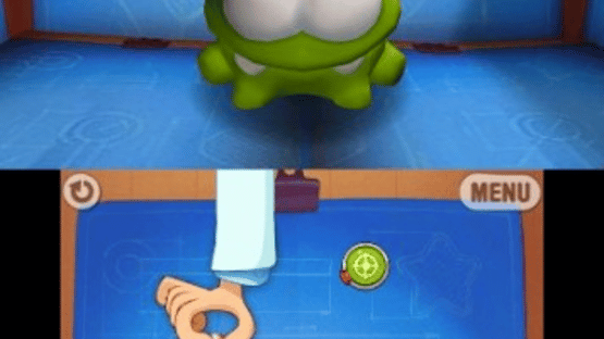 Top Screen On the top screen on the 3DS, it shows a 3D Om Nom (when playing Time Travel it will show two 3D Om Noms) that copies the 2D Om Nom on the bottom. When you get the candy to Om Nom it will also show the 3D Om Nom getting the candy. Bottom Screen On the bottom screen on the 3DS, it shows the actual gameplay. You use the stylus to cut the ropes, like how you cut them using your finger on the iOS version.