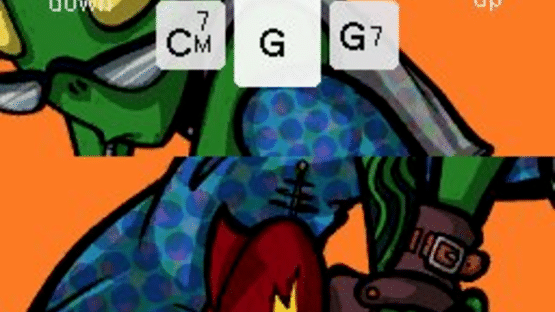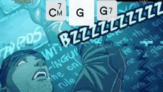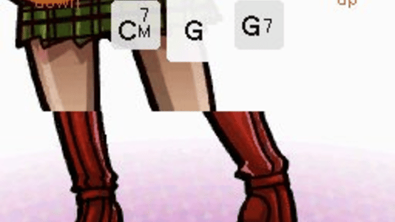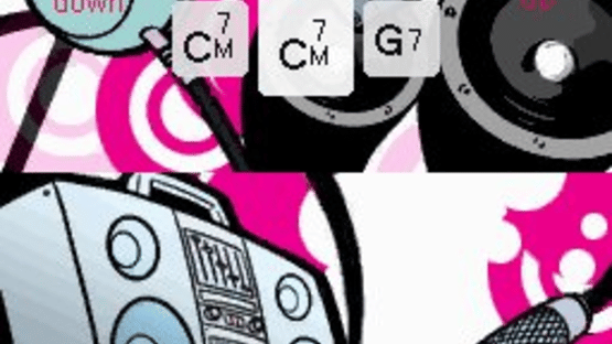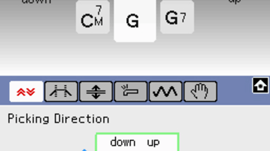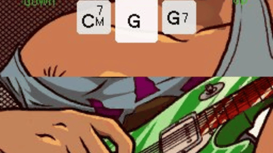 A guitar-playing Nintendo DS game.The Nintendo DS touch screen represents a guitar's strings and the D-pad / buttons become the fingered chords. By "strumming" on the virtual strings you'll play the chord that you've selected on the D-pad. The tool recognizes both up and down strums at half and full velocities, and you'll hear the subtle changes to the chord in the different ways to play them.