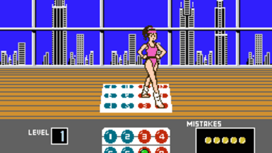 Dance Aerobics is a chance to get fit by following the movements of an aerobics instructor. Players use side B of the Power Pad accessory (a floor mat with 12 pads in a 4 by 3 grid) to follow the movements of an aerobics instructor. To succeed the player must press the pads with their feet and hands at the same time as the on screen aerobics instructor. Any missed movements are recorded on a mistake counter and 10 missed movements will fail the level. The routines (a set of repeated movements) start slow and simple with a bit of no-penalty practise time however as the player gets better the routines get more complex with less practices time. Each level has a set number of routines that increase with each level from 4 at the start to a total of 32 on the final level (level 7). At the successful completion of each level the player will get a pass stamp which they can enter later to skip that level.