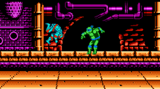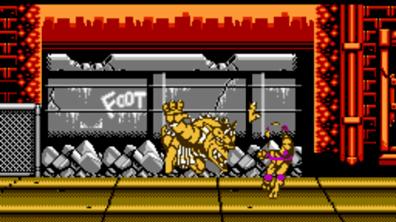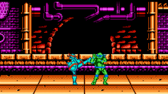 Trash the surf board and heave the 'za. It's a whole new breed of Turtles and they're fixated on fighting. We're dead serious, Tournament Fighters takes dude-on-dude demolition to new heights of intensity with 4 modes of pain-producing battles, deadly warriors, secret arenas, astounding graphics and sound effects that'll make you cringe! Clash with Krang-created clones of the Turtles, Casey Jones, April O'Neil, Ray Filet and Sisyphus, plus bosses Triceraton, Krang's Android and Karai. There's flying body presses, knee drops, head butts, rocket punches, elbow smashes, somersault throws, you'll feel and inflict them all. And the settings include Magma Ocean Planet, Jungle Planet, and every other bizarre corner of Dimension X!