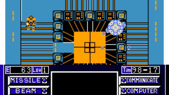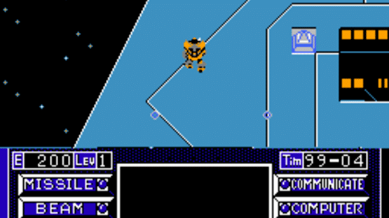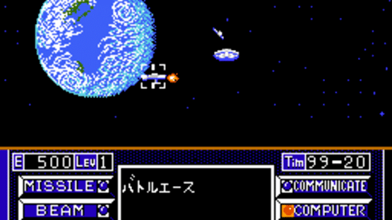 Uchuusen: Cosmo Carrier is an action strategy game where you pilot the titular Cosmo Carrier and combat aliens while gaining intelligence on the solar system, the planets and its moons. Information you gather from satellites with your deployable Mechs will help you find the alien force and destroy them. Once deployed your Mechs walk around the surface and fight turrets and find items/clues. Your viewscreen is where you target alien space-craft, astronauts, moons, and planets and interact with them. The interactions allowed are: Missile, Beam, Shiled(SIC), Move, Communicate, Computer, Parts, and State. Missile launches a rocket with adjustable strength at your target. Beam shoots a laser weapon at your target. The misspelled Shield function lets you decide if you want your shields on or not. Move button has two different sub selections; Warp and Land. Warp lets you travel from planet to planet while Land lets you deploy one of your Mechs on to the surface of a satellite or enemy cruiser. Communicate lets you do just that, communicate with planets and other vehicles. Computer gives you read-outs on targeted planets and vehicles. The Computer also is where you perform repairs on your ship or Mechs. Parts lets you see what weapons you have loaded. Finally, State, gives you detailed information pertaining to shields, weapons etc of your Cosmo Carrier and three Mechs; Gravity, Blizzard and Field.