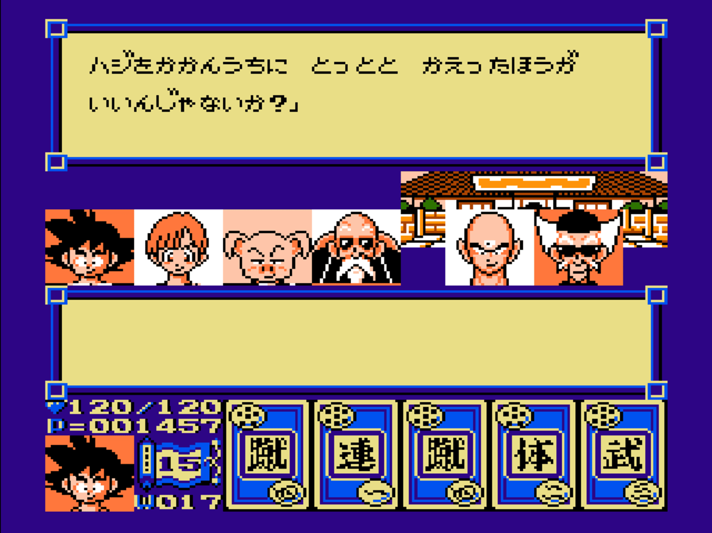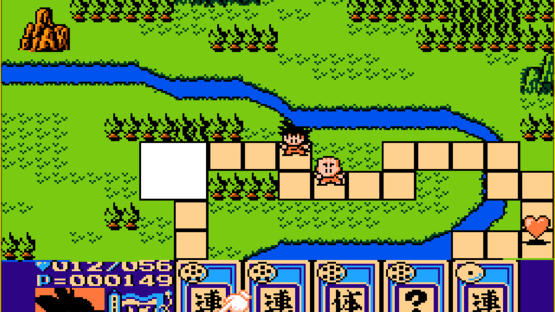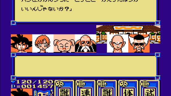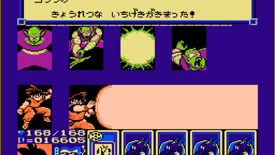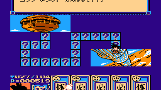 Dragon Ball 3: Goku-den is a role playing video game released only in Japan by Bandai. It is the third Dragon Ball video game for Famicom (its predecessors being Dragon Ball: Shenron no Nazo and Dragon Ball: Daimaou Fukkatsu). Its sequel is Dragon Ball Z: Kyoushuu! Saiyan. You control Son Goku and his friends Krillin and Yamcha in this game. The gameplay is mostly based on training your characters and then taking them to fight enemies, advancing the plot. All the activities in the game (including walking around on the world map) are performed through choosing one of the available cards. Depending on the value of the card, you can move a certain amount of squares on the map, have an advantage in a battle, etc.