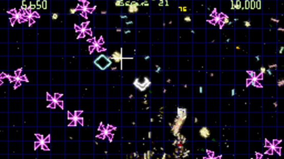 Geometry Wars: Galaxies is set in a space-like environment where the player must shoot geometrical shapes in order to score points, gain lives, acquire bombs and survive as long as possible. The game is played to an upbeat electro soundtrack.