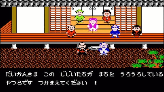 This is an adventure game based on a TV show about a retired governor and his retainers going around solving problems in Edo period Japan. The game allowd players to assume the role of one of the retainers as they go around investigating the town. Occasionally this involves fights with corrupt officials, evil samurai and gangsters. There's also a female ghost that will drain the player character's life if it comes into contact with them. The game is noted for its many instances of speech samples. It also has a considerable amount of text. The game consists of seven stages. Players control Kaku-san (Kakunoshin), a jujutsu user, in the odd-numbered stages and Suke-san (Skesaburo), a katana user, in the even-numbered stages, and go around the action stages to collect evidence of evil deeds. The use of certain items allows the player to switch to a ninja or a servant for a certain period of time. The ninja can go undercover and the servant can interview the townspeople. In every stage, there is evidence that can only be obtained by ninjas or servants, and they must take turns. Each time evidence of wrongdoing is collected, the clue gauge rises, and when it reaches its maximum, the stage is cleared by presenting the evidence to their lord, Mitsukuni Tokugawa (Mitokomon), who is waiting for them at the inn. If the time limit is exceeded without collecting all the evidence, the player is forced to proceed to the next stage, but the final stage cannot be completed until all the stages have been cleared.
