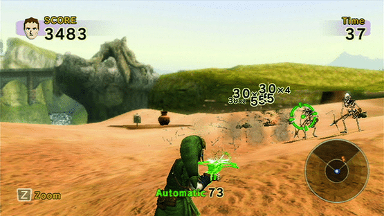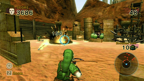 Link returns from The Legend of Zelda: Twilight Princess to pick up the Wii Zapper and take aim at a host of targets in this shooting-gallery-style game. Anyone can pick up the Wii Zapper and become a master marksman in the quick-play shooting galleries of Link's Crossbow Training. Dozens of fast-paced stages offer a wide variety of game play, from shooting stationary targets to defending a supply wagon from onrushing hordes of enemies. Multiplayer modes let players and their friends share a Wii Zapper to shoot for the high score. Link's Crossbow Training comes bundled with the Wii Zapper. After a few rounds of Link's Crossbow Training, players will be more than ready to pick up any of the future Wii Zapper titles, like Medal of Honor Heroes 2, Ghost Squad and Resident Evil: The Umbrella Chronicles. Link's Crossbow Training contains three basic game styles: target shooting, defender and ranger. There are 27 stages in total, and these categories represent only generally how each individual stage operates. Each stage's goal is to earn the highest score possible within the time limit. All rounds can be played with multiple players: Players pass the Wii Zapper around and then play one at a time and compete for the high score. Target Shooting: In target-shooting rounds, players shoot bull's-eyes as they pop up on the screen. In early stages, targets are stationary. As the game difficulty increases in later levels, the targets move. Hitting the center of the bull's-eye nets more points, and hitting targets in succession without missing earns combo multipliers. Link can aim anywhere on the screen. Defender: In defender rounds, players remain stationary but can look and aim in all directions – sometimes even in a full 360 degrees – by aiming off screen. Hordes of enemies assault Link, and he must fight them off. These battles have a great deal of variety, from fighting off skeletons in a desert to defending a wagon from boar-riding Bokoblins. Ranger: In ranger rounds, players can move throughout the level using the control stick and aim anywhere they want by aiming the Wii Zapper wherever they want to look. In these missions, Link storms enemy encampments, fights his way through a forest and seeks out his foes while exploring the environments. The Wii Zapper requires the Wii Remote and Nunchuk, housing both in a comfortable and intuitive frame. The control stick on the Nunchuk controls player movement (on stages that allow player movement), while simply aiming the Wii Zapper moves the targeting reticule on the screen. Pulling the trigger fires Link's crossbow. By aiming off screen, players can turn Link to face in a new direction (again, on stages that allow this).
