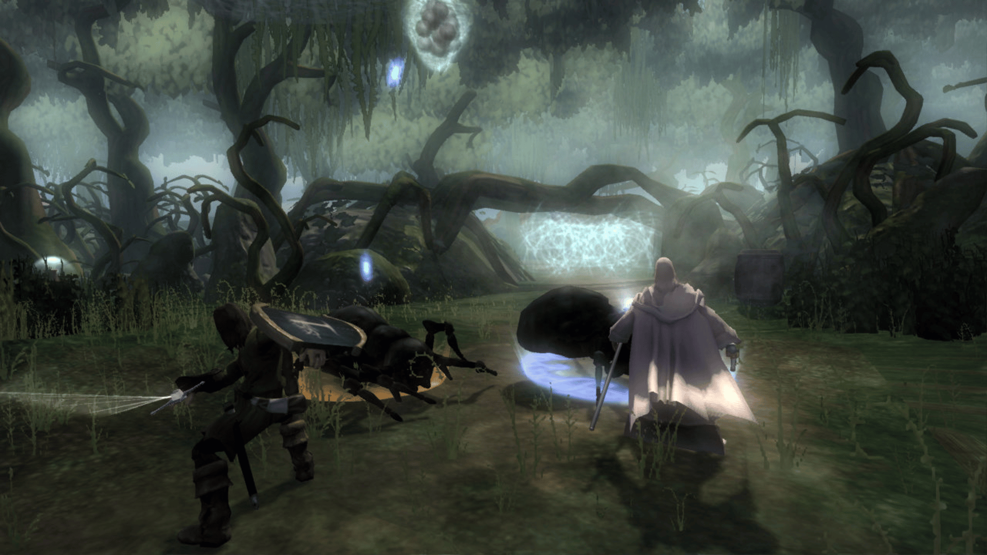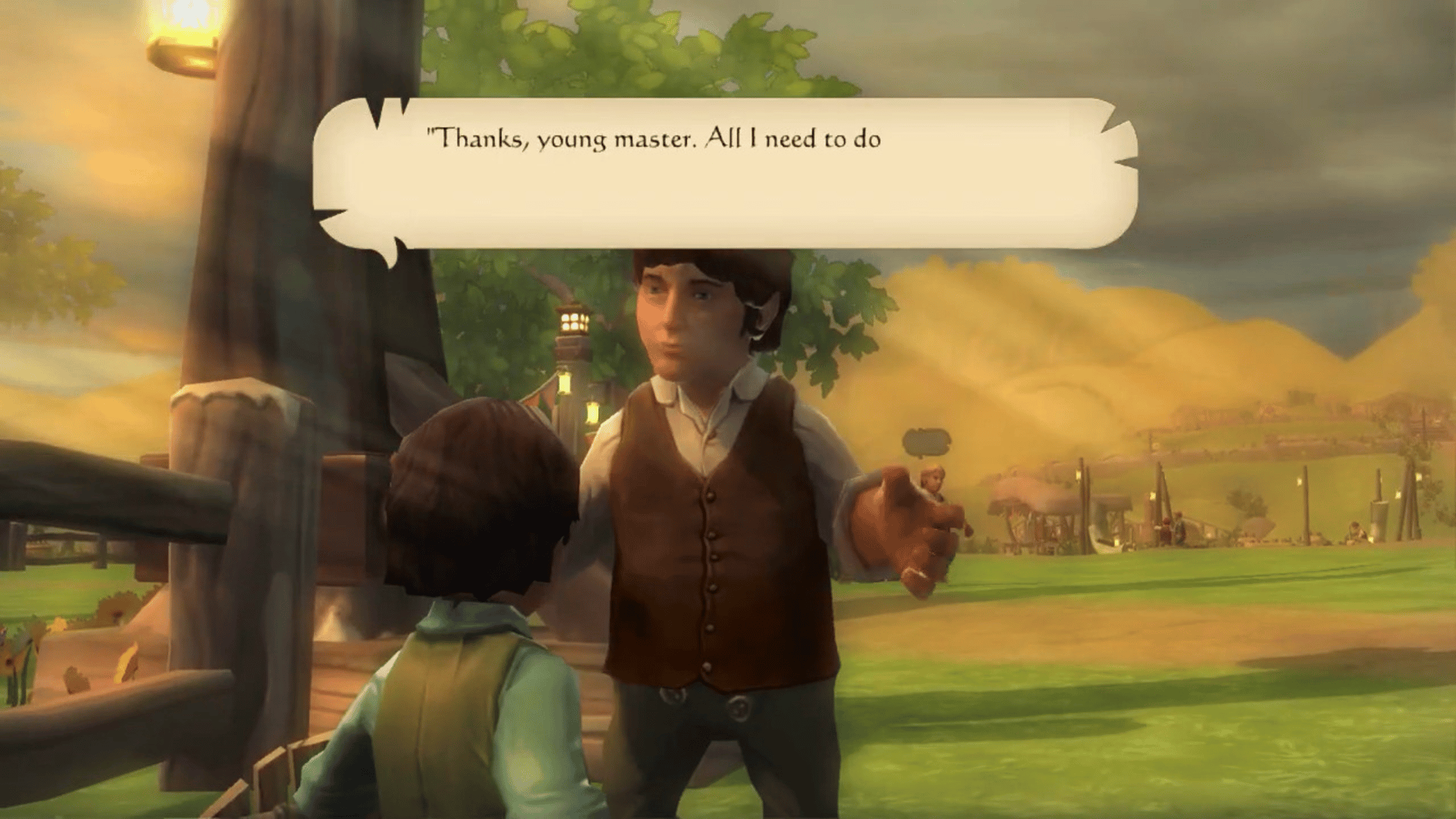 The Lord of the Rings: Aragorn's Quest for the PS3 and Wii tells the story of Aragorn during the War of the Ring. Samwise Gamgee is narrating, and recalls the story to entertain his children who want to hear about the adventures of Aragorn. The game differs in several ways from the PS2 and handheld versions - the biggest being the behind view perspective, as opposed to the birds eye of the PS2 version, and the 'between the main story sections' gameplay in the Shire. The Wii version has different shading and lacks many voice acted lines for NPCs, as well as the intro sequence features different art for the story telling. The game also lets you attack by swinging with your Wii remote or the Move controller for Playstation 3. The game also supports local co-op where the second player controls Gandalf.