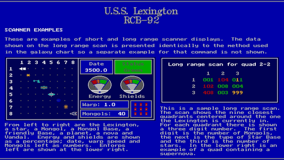 EGATrek puts you in command of a starship in a battle to save the galaxy. A large invasion fleet has arrived and you alone are responsible for fighting off the invaders in your quadrant. You'll be kept busy figuring out battle strategy as you go from encounter to encounter. In addition, you'll need to find star bases to resupply your ship. You may be called on to make rescues of other ships or planets. And you must do it all as quickly as possible without running out of fuel or getting your ship destroyed.