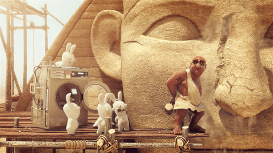 Raving Rabbids: Travel in Time is a party game for the Wii in which the titular Rabbids travel back in time using a washing machine. Its various co-operative and competitive mini-games can be played alone or with 2-4 players both online and offline. The game is centered around a museum from which the Rabbids Travel to different time periods and places. There are five main types of gameplay with a number of variations on each set in different locations and times. The games include flying, racing, fishing, shooting and 2.5D platforming.