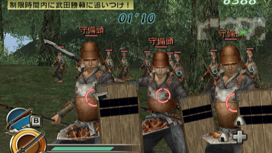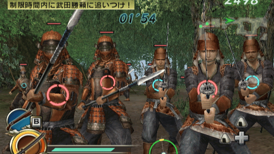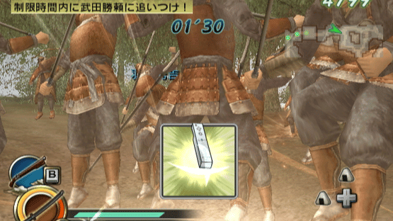Samurai Warriors: Katana is an action video game set in feudal Japan and is based upon the Samurai Warriors series. The game is played with the Wii Remote and Nunchuk attachment, and the action is seen from a first-person viewpoint. In battle, the player character is equipped with one melee weapon (such as a sword or spear) and one ranged weapon (such as a bow and arrow or cannon). The player can freely switch between melee and ranged weapons during combat. Attacks are performed through either pressing the attack button on the Wii Remote to attack single enemies, or motion-based attacks that can damage groups. The game also includes a competitive multiplayer mode for two players. Outside of combat, there are running sequences where the player must swing his/her arms with the Wii Remote and Nunchuk in hand to simulate the arms pumping in a running motion. Horseback riding is also included, with the Wii Remote performing the function of the reins while the Nunchuk is used as a whip.