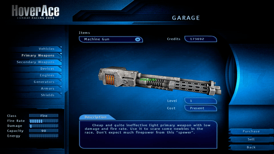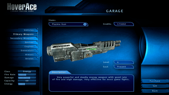 Hover Ace is a futuristic arcade racer with guns. Player takes in control one of five types of hovercrafts (Bike, Scout, Sport, Police and military) and participate in events on different planets (Earth, Venus, Mars and Planet of Glaciers). After the events, he receives money award, which could be spent on new weapons, hovercrafts, items or used to upgrade already installed ones.