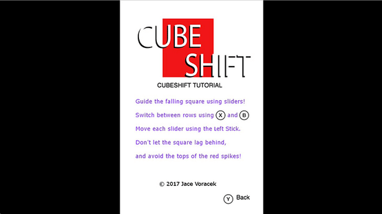 Cubeshift is an infinite arcade puzzler. Help guide the falling square using sliders! As the square falls, it will land on a layer of sliders which can be manipulated to guide the square past each layer. Watch out for the spikes, touching the top of those or causing the square to lag behind will result in a game over!