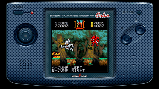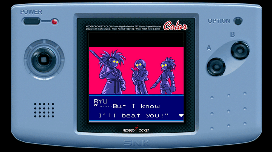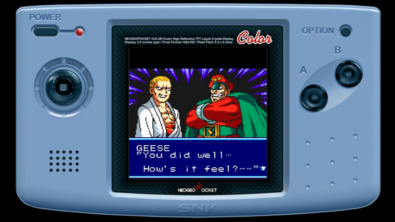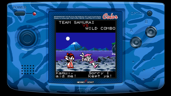 With 18 starting characters (26 total after unlocking), numerous battle modes and varied minigames, this may be the largest fighting game for the Neo Geo Pocket Color. Choose the fighting style that suits you from the available Single, Tag and Team modes. The SC Olympic mode grants access to minigames from a music game featuring Felicia to a whack-a-mole style game with Jubei. The Olympic mode also allows players to compete for gold, silver and bronze medals in various fighting challenges. Link features include NGPC-to-NGPC battles and NGPC-to-Dreamcast data exchange with other SNK titles.