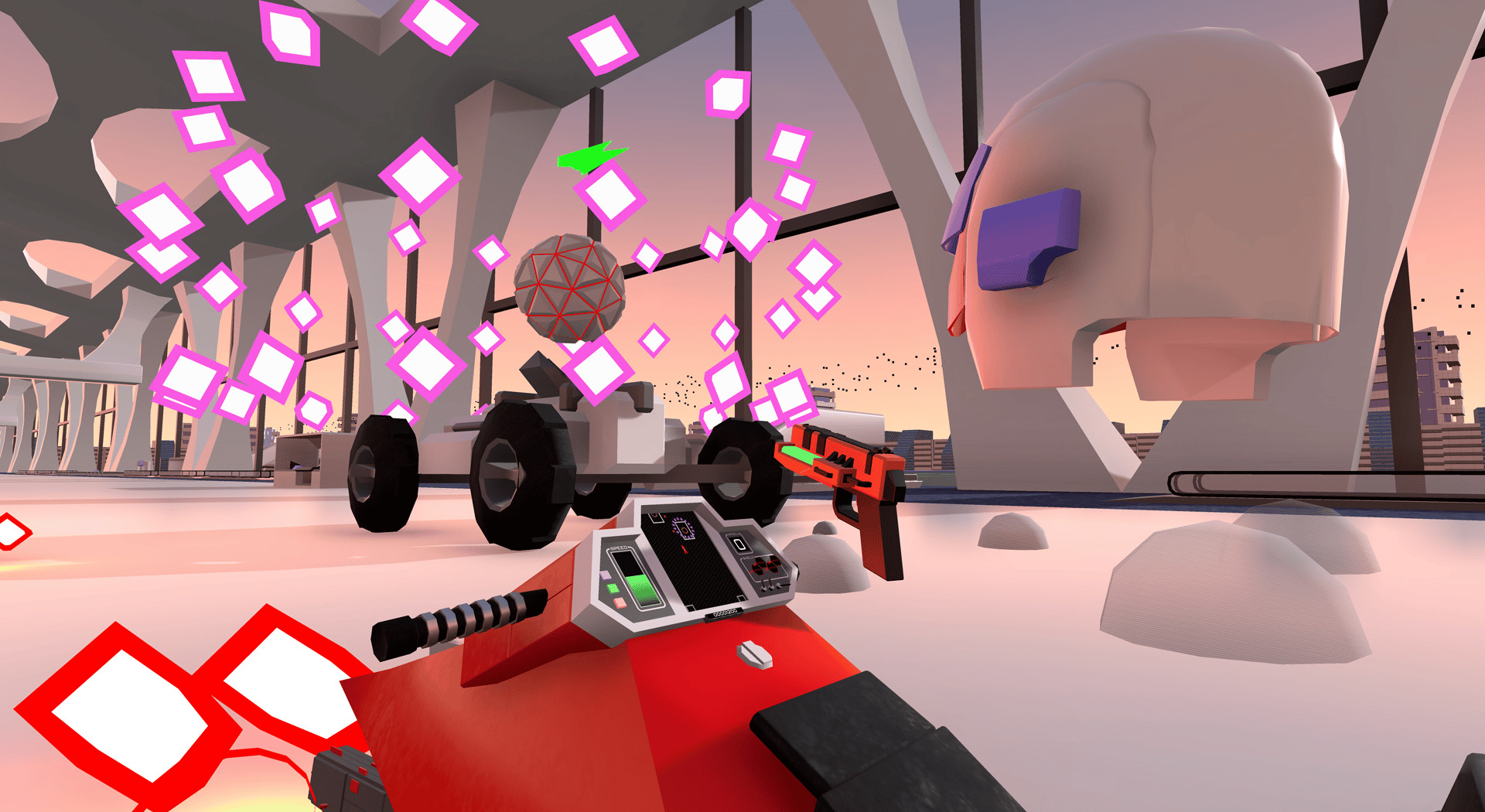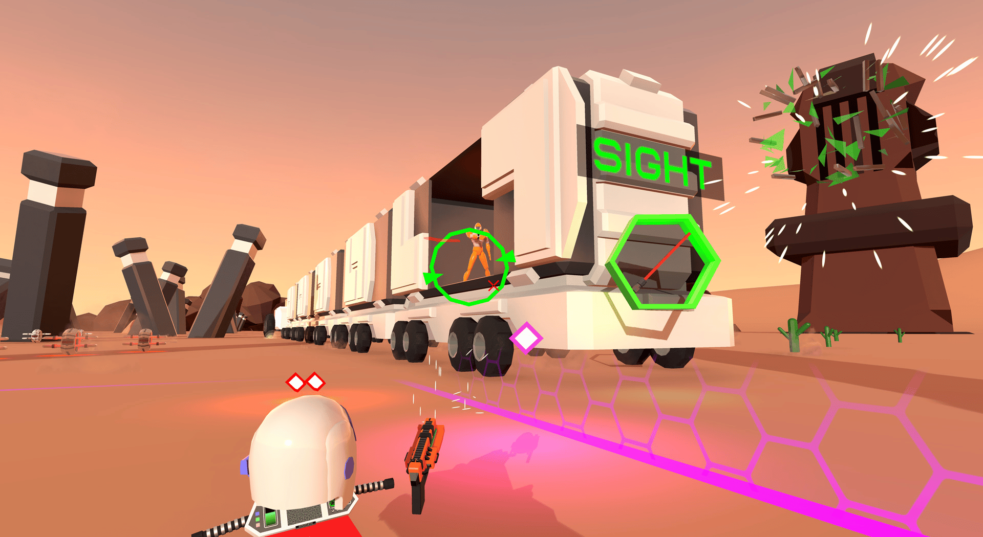 Blast your hovercycle through the enemy's crushing forces under a bright blue sky! Use your hovercycle to dodge enemy fire and attack armored ground targets while taking aim with your pistol to destabilize and destroy aerial foes! Use your radar to get your bearings when overwhelmed!