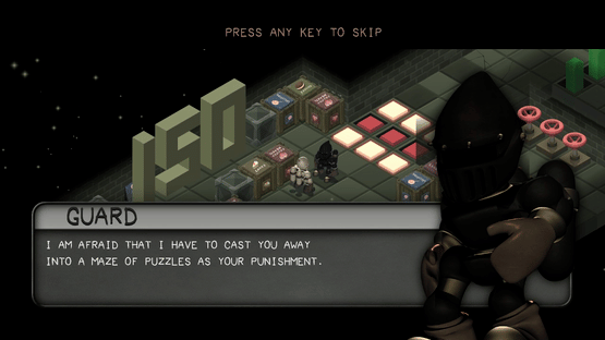 IsoBoom is a 2D isometric puzzle game about a small robot named SE01. The protagonist gets sent to a maze of puzzles as a punishment for theft. SE01 was promised forgiveness if he manages to beat the maze and escape.
