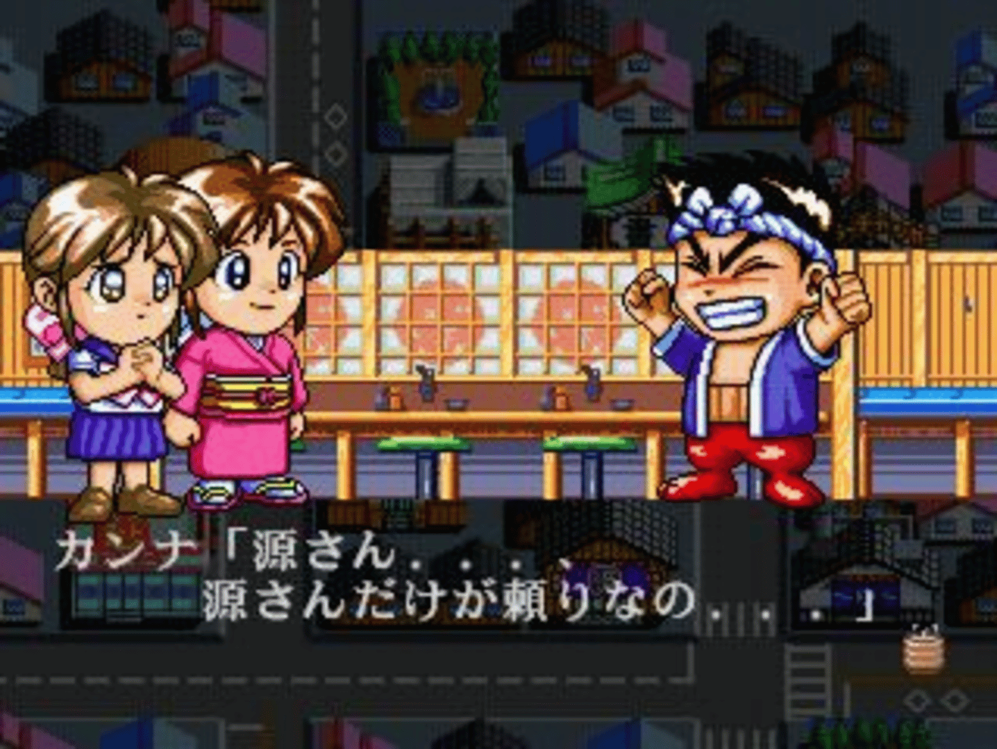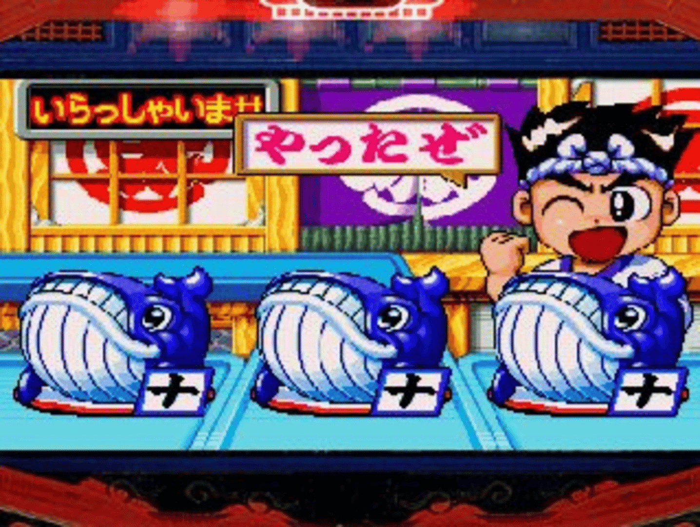 Sanyo Pachinko Paradise 4 - Sushiya da Gen-san!! is the fourth game in the longest pachinko gambling series (they continue the series in the Playstation 2 console) made by Irem. It features reproductions of three pachinko machines made by Sanyo Bussan based on the Gen-San character: CR . There are two modes available: Tsujo (Normal) mode allows the player to modify a wide range of settings for each machine, while Jissen (Battle) mode challenges the player to win as many balls as possible on the default settings with a limited starting pool and time limit. There is also a View mode where the various animations that play on the in-game display can be freely viewed. There is also a story mode in which Harry can go around the town.