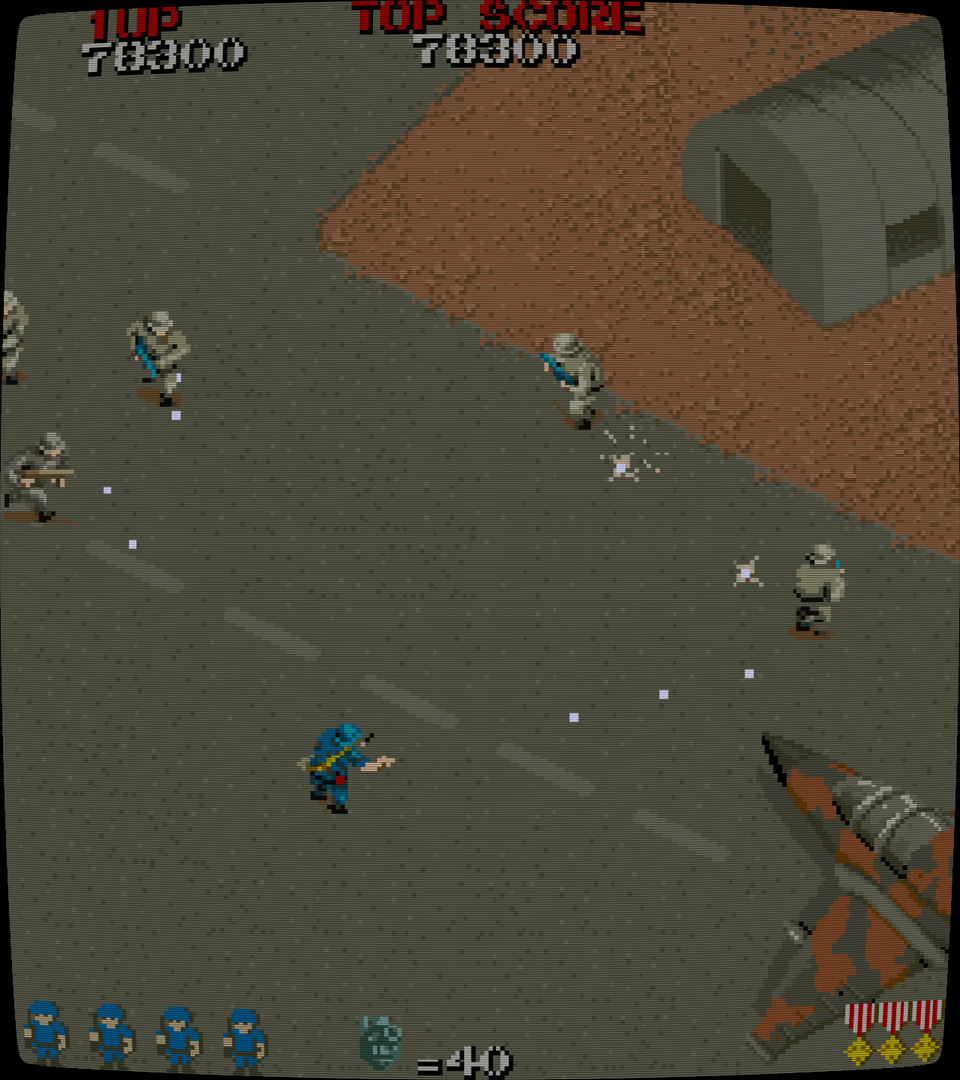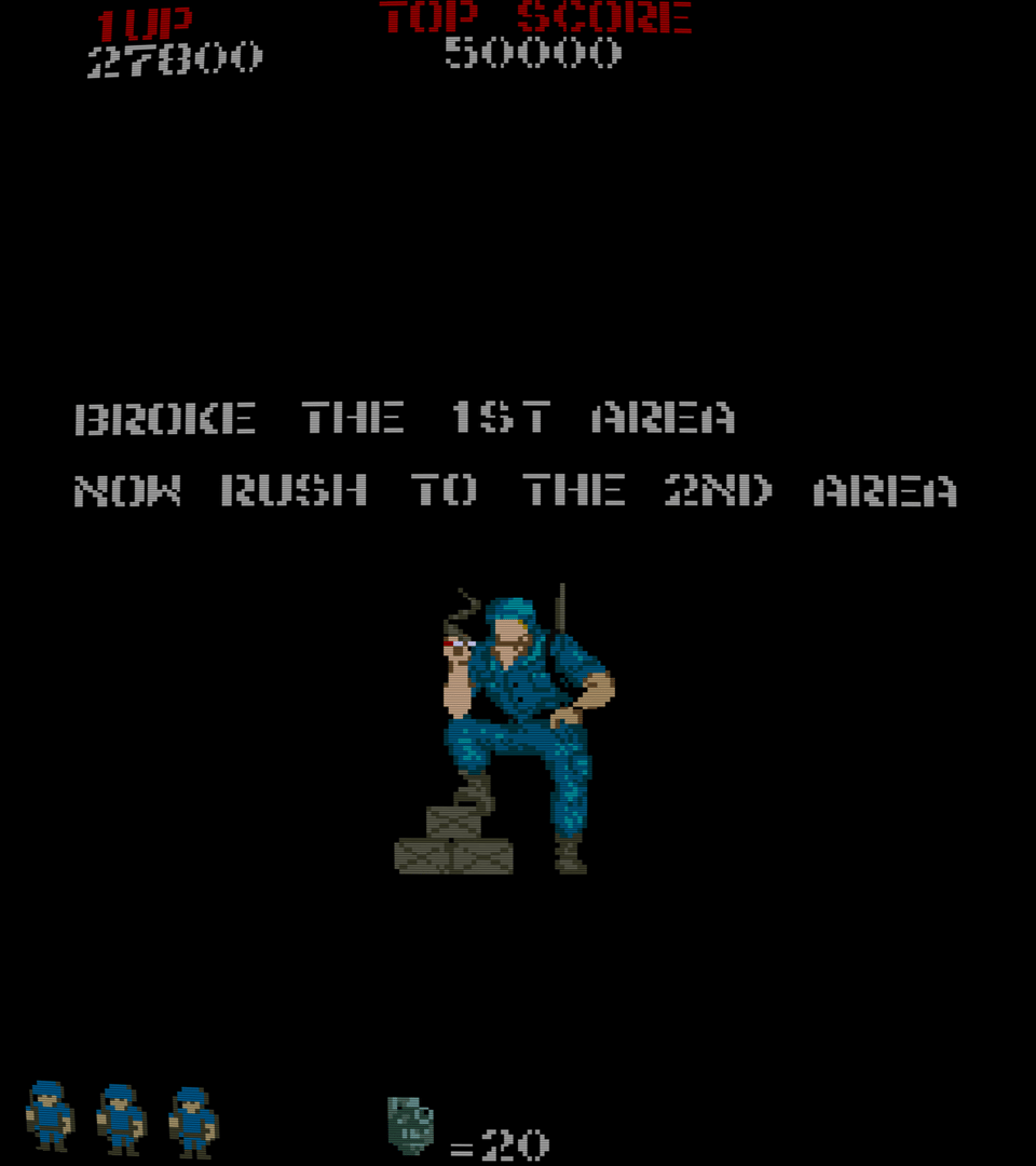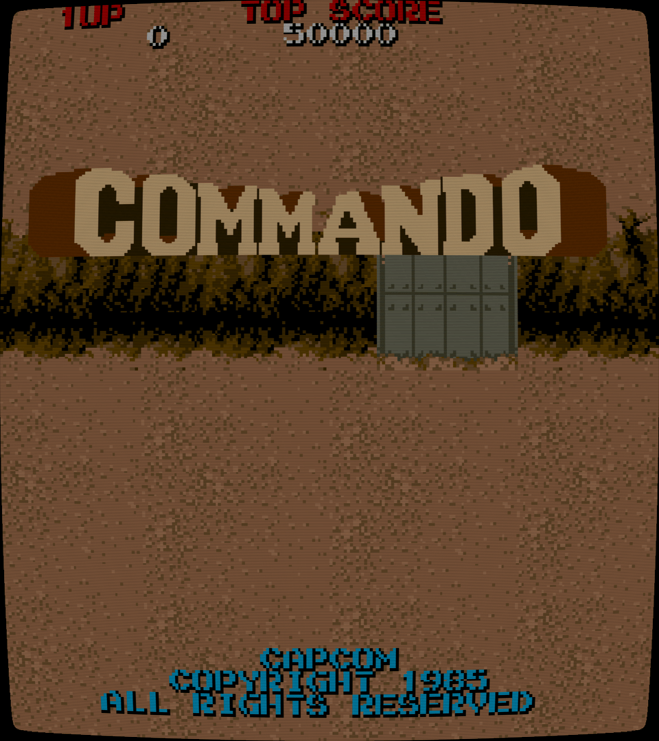 Several levels await your super-tough Commando in this arcade conversion. Armed with only a standard rifle and a few grenades you must take on hordes of enemies. Some are wandering around in the open, while others have picked out hiding places, which you must approach from certain angles. Trees, rivers and bridges create a varied combat-like terrain and must be incorporated into your thinking. Extra grenades can be collected, and will definitely be required, as they allow you to kill from distance and thus avoid some enemy shots.