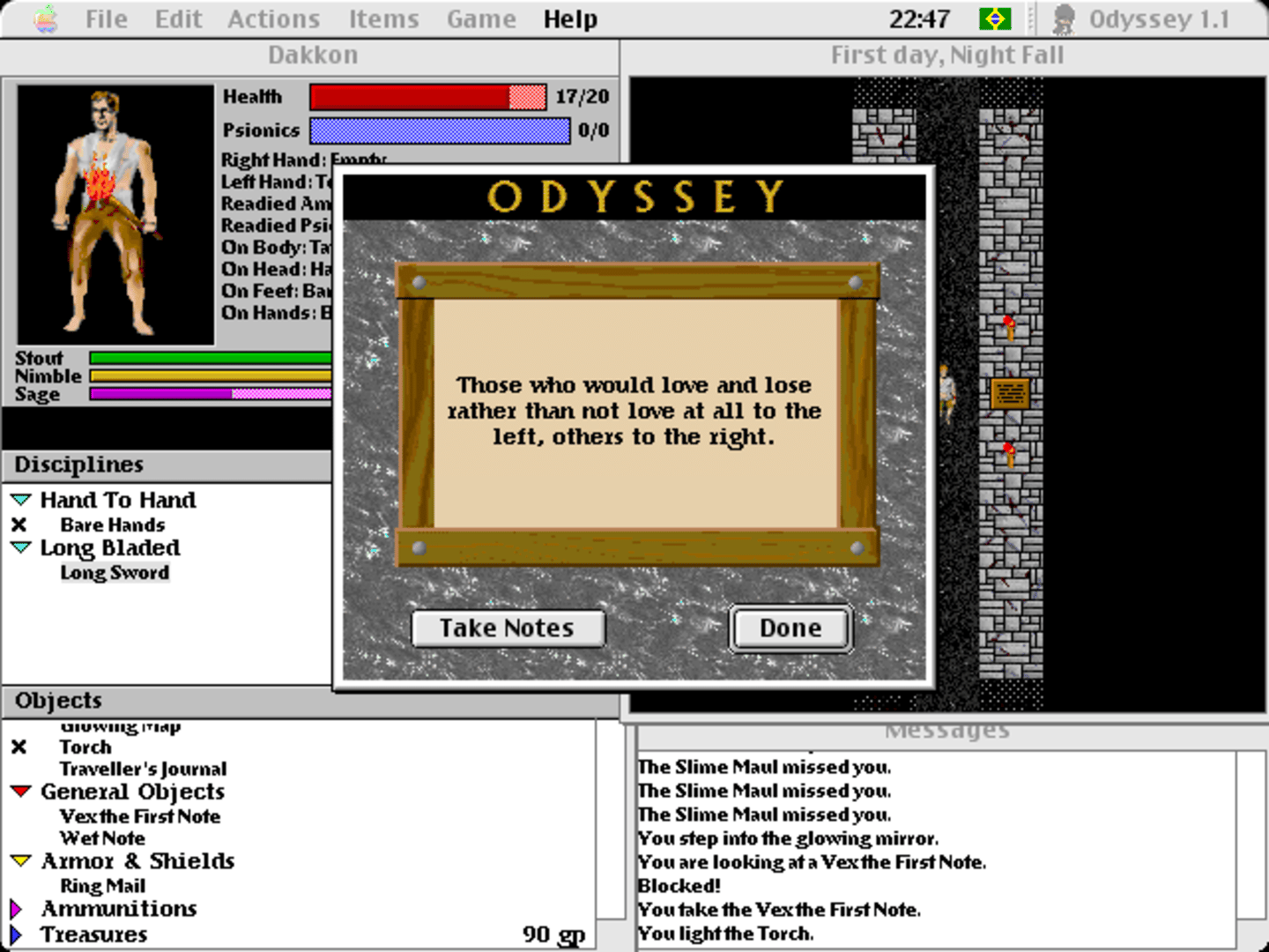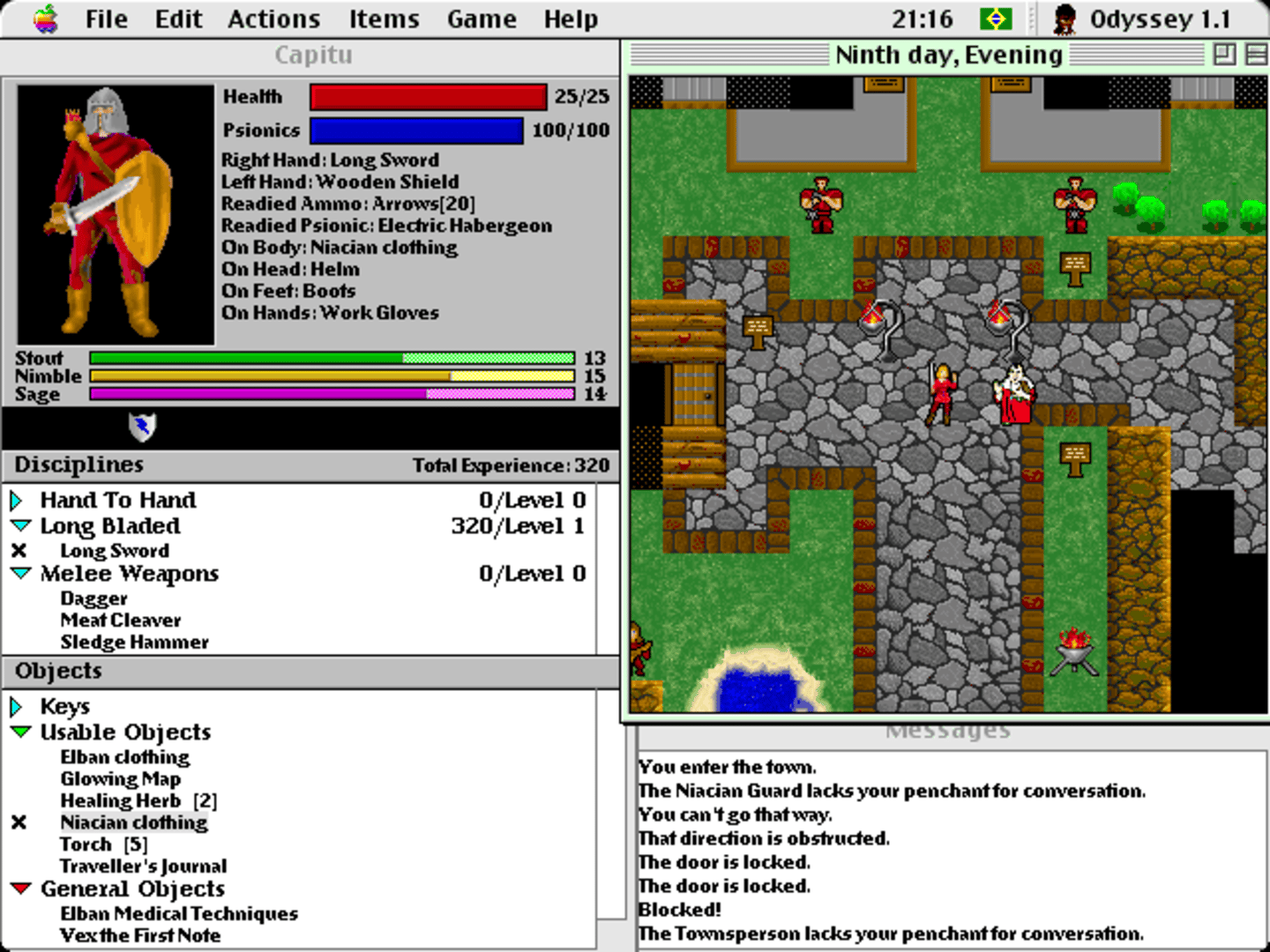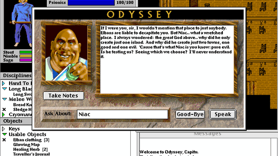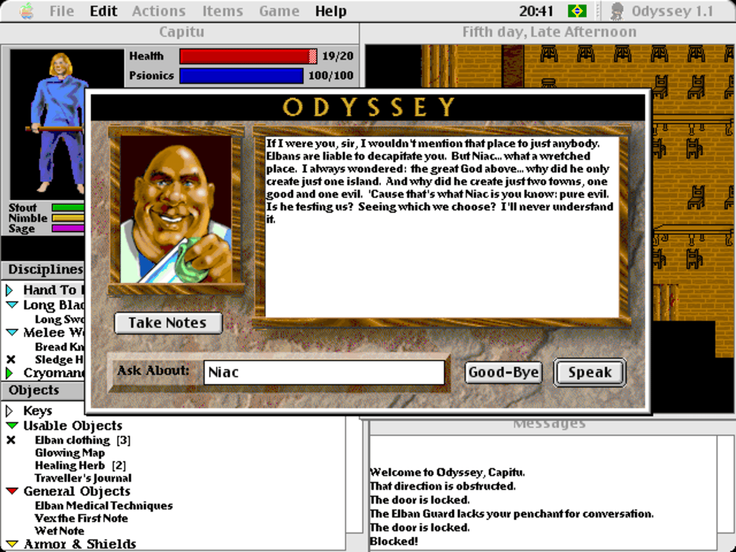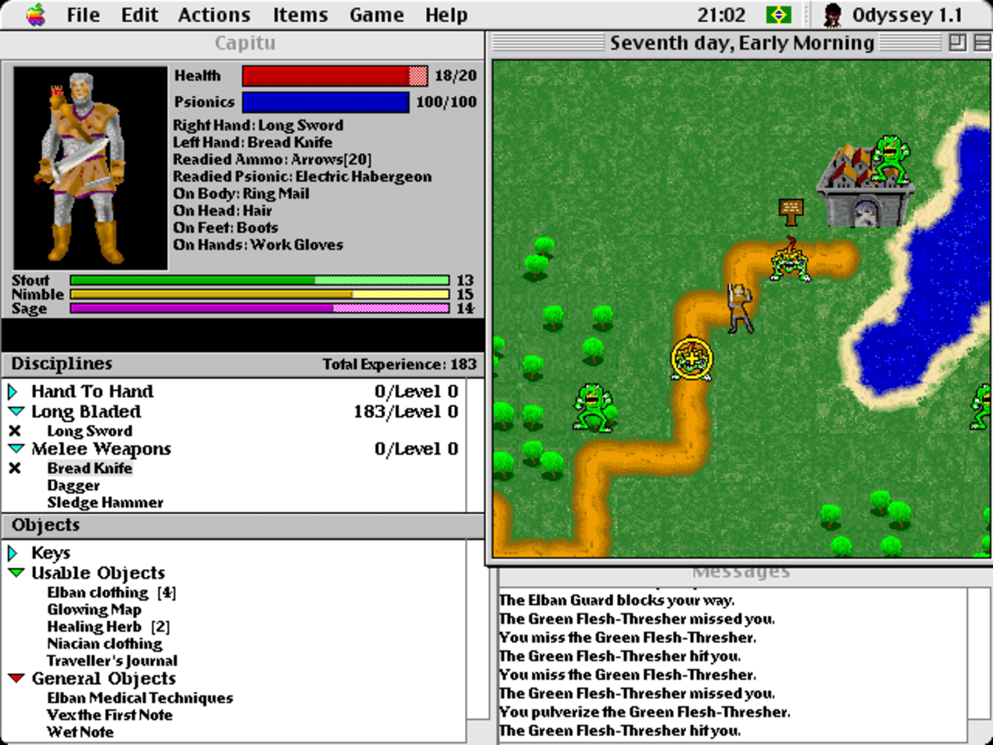 Odyssey: The Legend of Nemesis is a story-driven Western RPG, created by Paranoid Productions and released by Bungie for the Macintosh. Later, it was re-released as freeware with numerous bug fixes. The hero is an adventurer sent to find a powerful magical staff to cure a famine in their homeland. After acquiring the staff, their ship is wrecked in a freak storm, and they wash up on a strange island, the staff nowhere in sight. They must now find a way off this mysterious archipelago and possibly recover the staff. However, each island has a problem that can be solved in a number of ways.