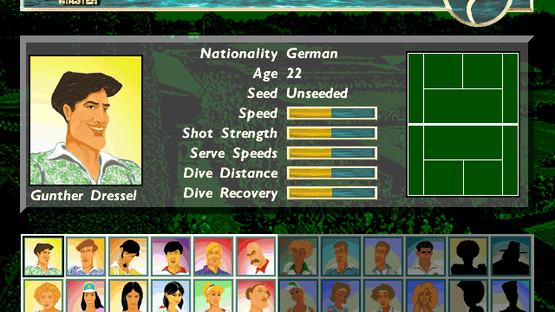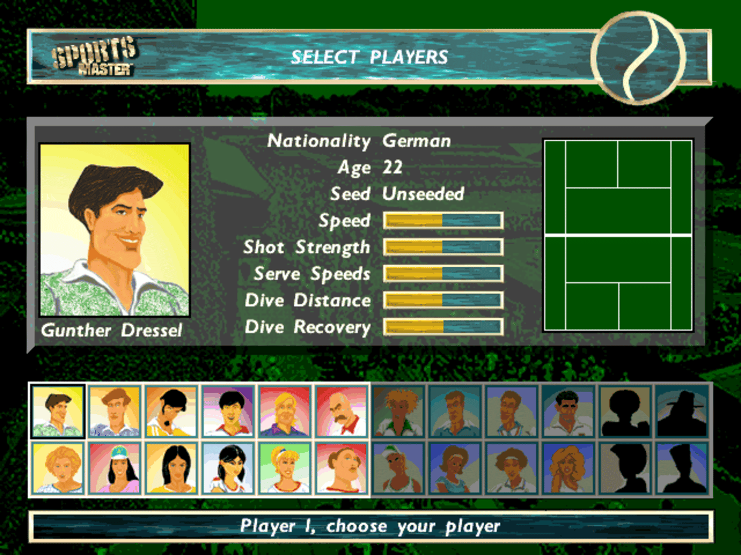 PC Port of "Sampras Extreme Tennis" Codemasters used their Pete Sampras license for a second time on this tennis game. Playing as either a male or female in singles or doubles matches, your ultimate aim is to win each of the 8 matches, which represent the finals of 8 tournaments The four Grand Slam tournament venues are unlocked when you win tournaments on the other four (in Barcelona, Hong Kong, Frankfurt and Moscow). Single matches or quick multiplayer knockout tournaments can also be played, the latter with up to 8 human players. Lob, slice and drop shots each have their own control buttons, and spin can be comfortably applied. Serving involves stopping a curving arc at the right moment - there are three serve speeds and the arc's motion reflects this, so it is harder to get the faster serves accurate. Ten camera styles are available, encompassing both fixed and moving camera work.