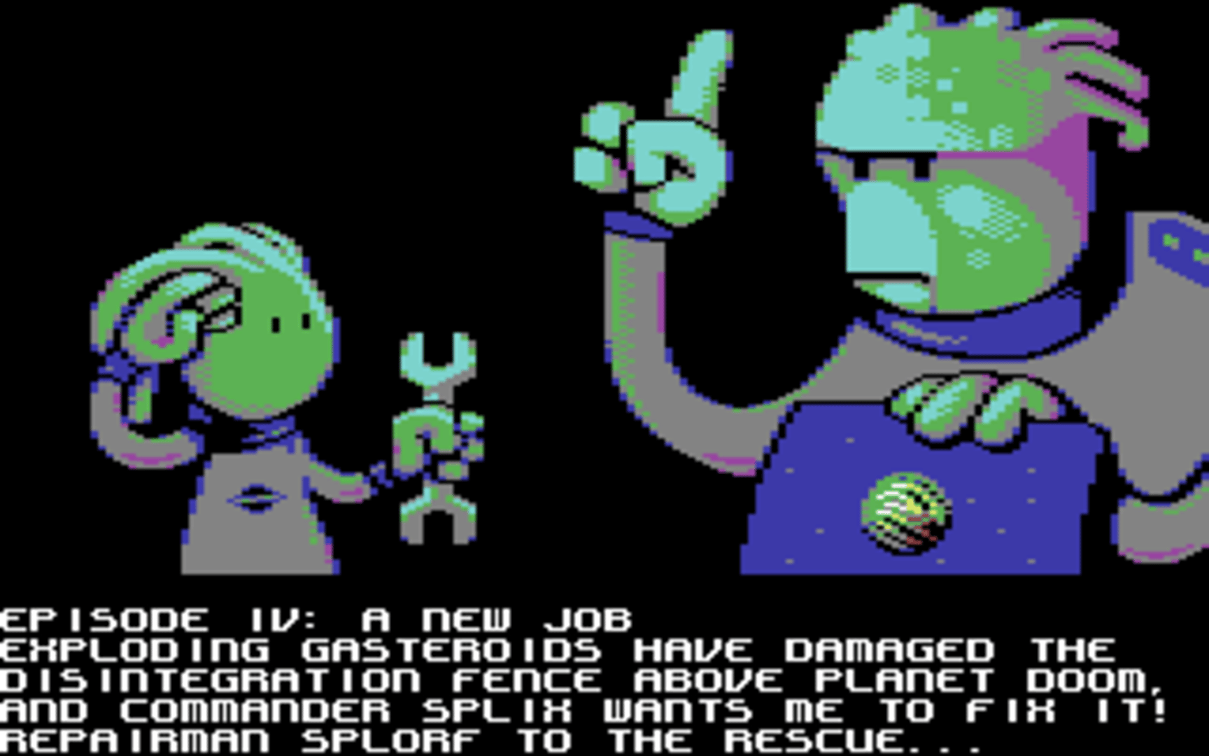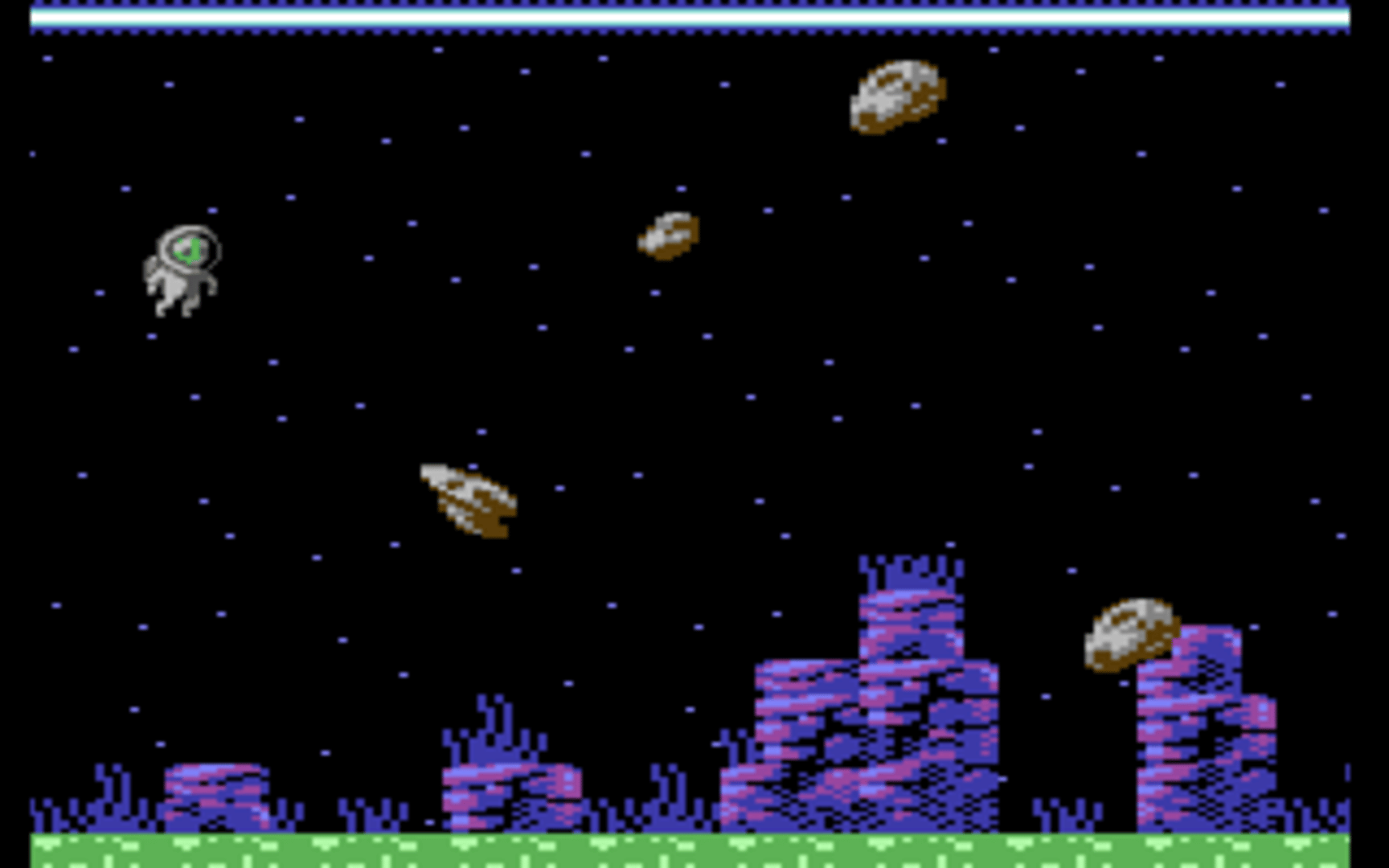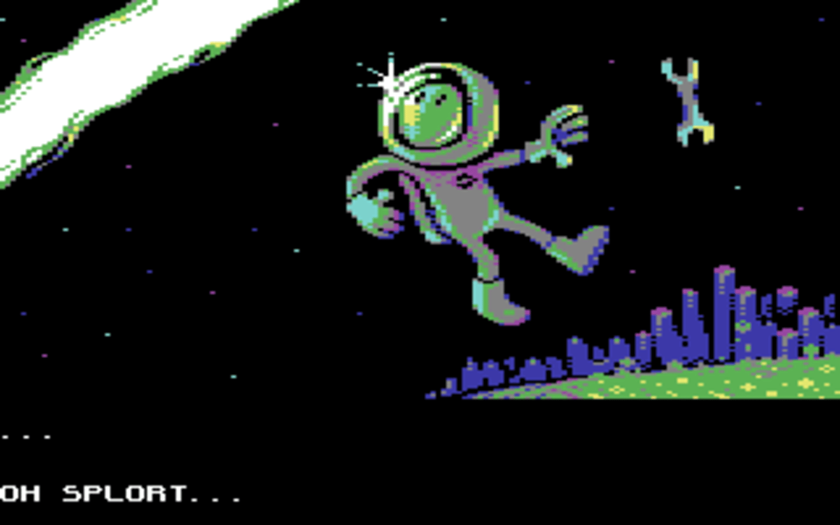 A one-button arcade game. Players guide Splorf, a sanitation engineer stranded on Planet Doom, using a jetpack to dodge asteroids and hazards while aiming for the highest score.