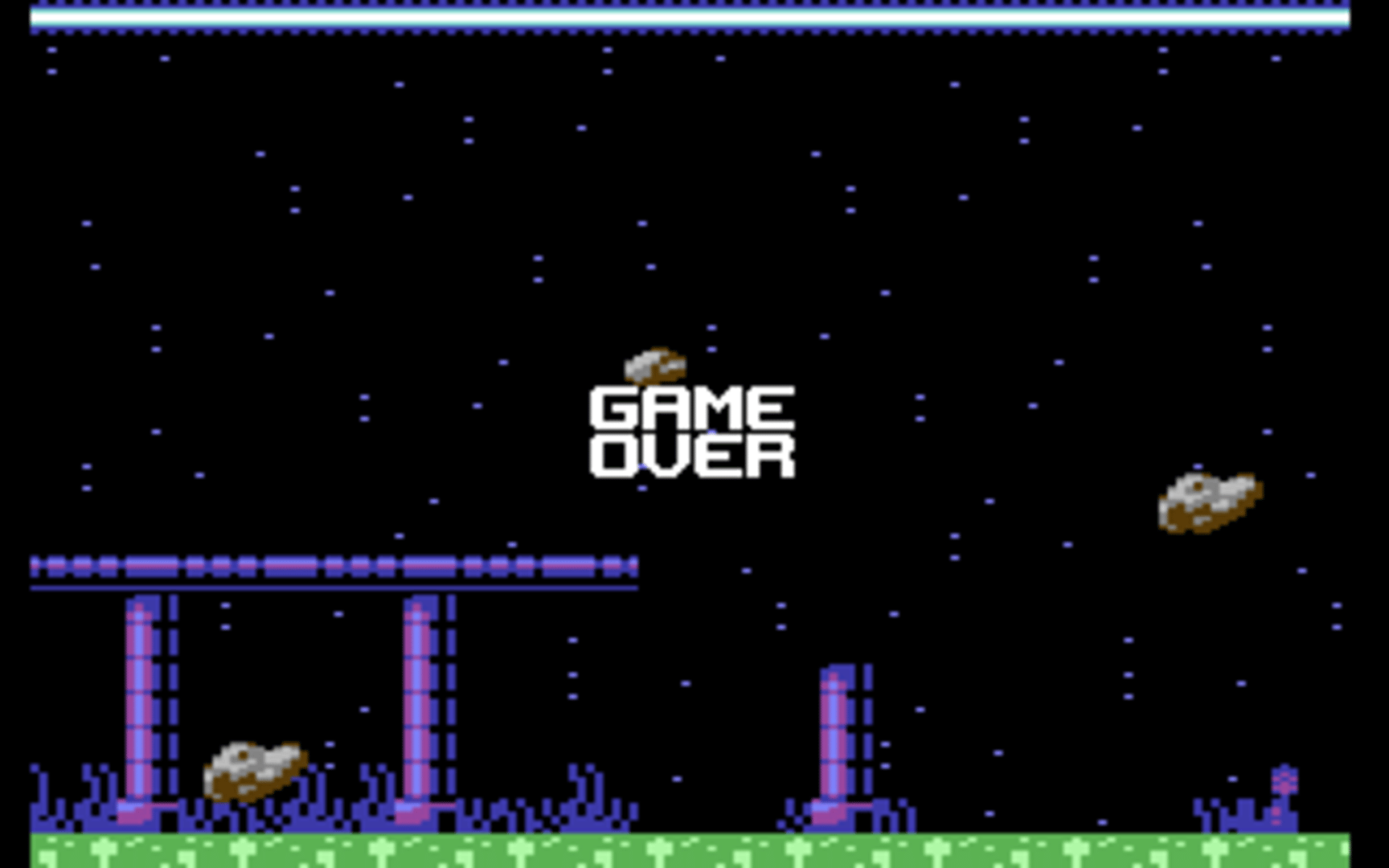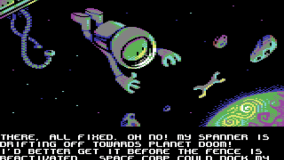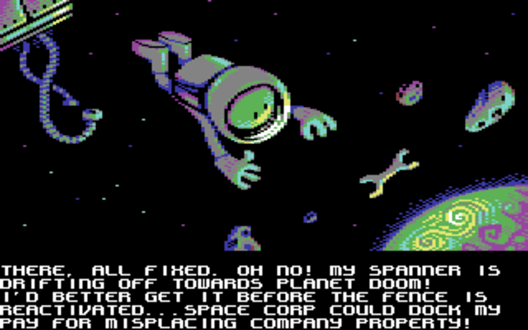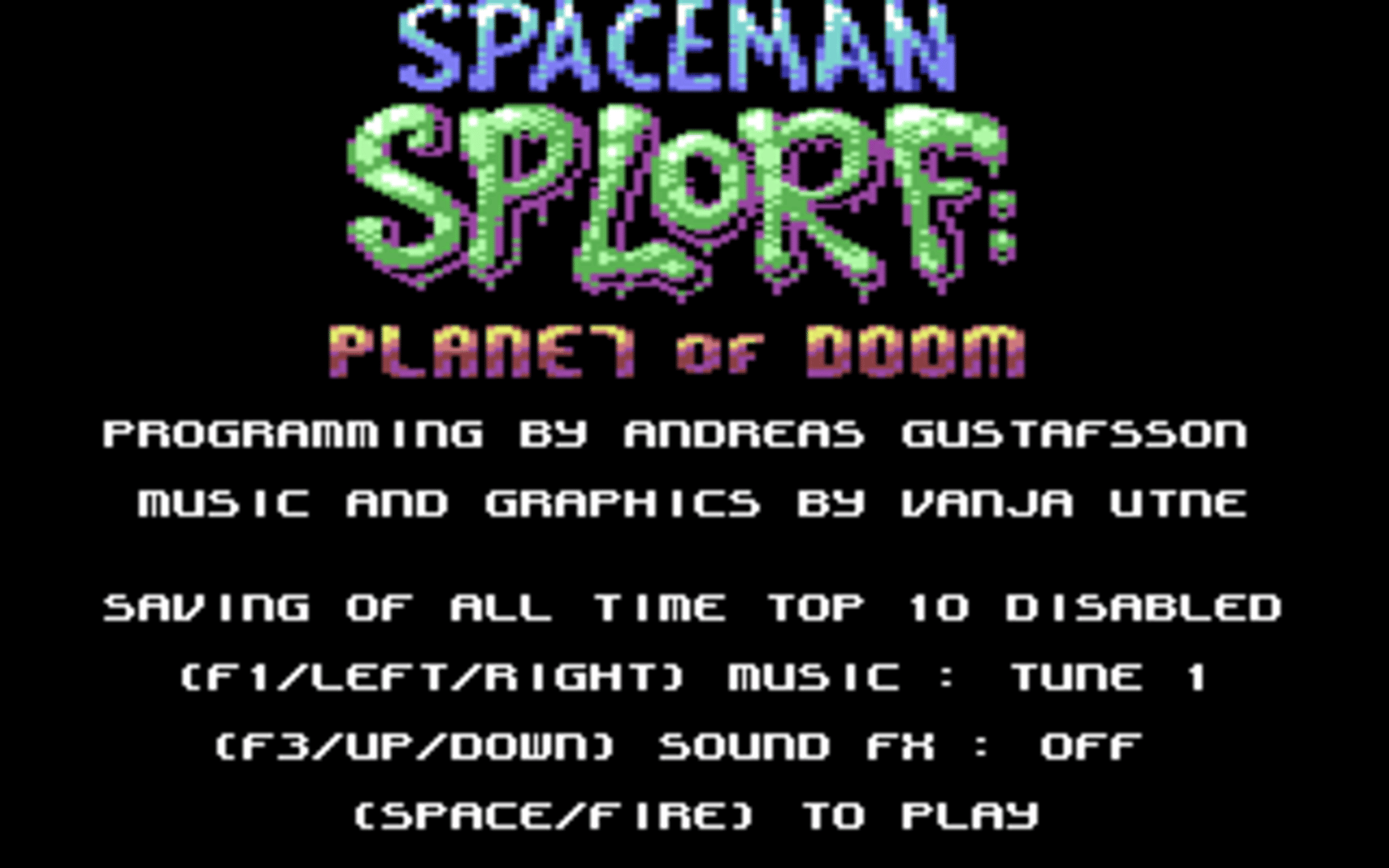 A one-button arcade game. Players guide Splorf, a sanitation engineer stranded on Planet Doom, using a jetpack to dodge asteroids and hazards while aiming for the highest score.