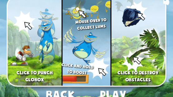 Rayman: Slap Flap, and Go! is a game in which Rayman needs to punch Globox at the right time to send him flying! While Globox is in the air, try to collect as many lums as possible to power up and fly further in order land as far as possible.