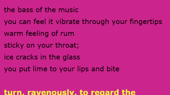 Sacrilege is a dating sim, created with Twine, about being heterosexual and conditioned to isolate one's self from others. The game explores the nightclub environment.