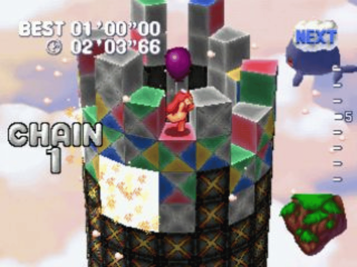 Tall twins tower is the sequel to Tall Infinity and in this case the game was never released outside Japan. As in Tall Infinity the player manipulate multi-colored blocks to construct a tower. The players needing to complete ten floors of the tower to pass each stage. Players must avoid unnecessary moves or risk losing the game. There are three difficulty levels and different game modes (like endless mode or time attack). One of the new features is the slide mode in which using the R1 and L1 Button the player can move a whole line of blocks to the right or to the left, the game also features a 2 players split screen vs mode.