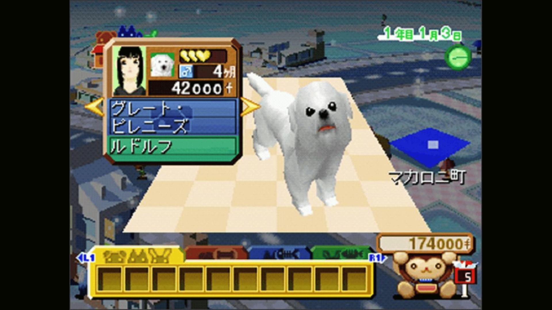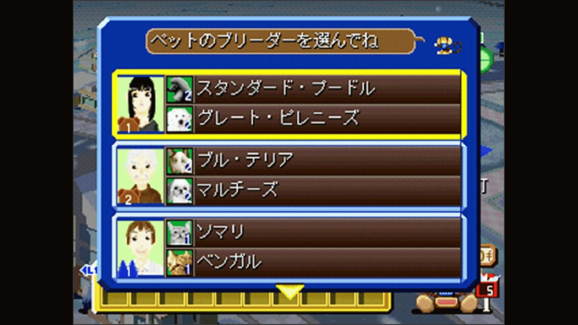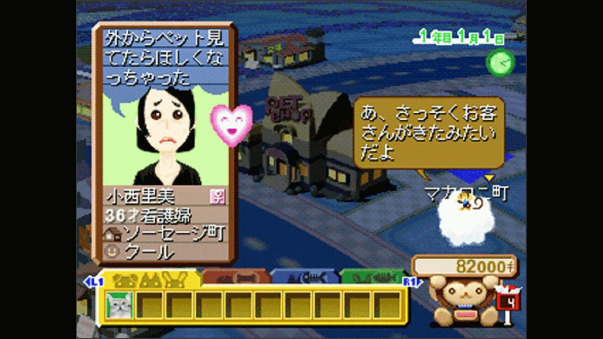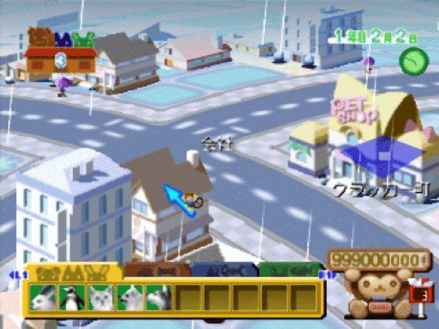 Pet Pet Pet is a mix between a virtual pet simulation and a strategy game. In the game the player is the owner of a pet shop in the town, he can buy new pets for the shop (the game features a lot of different animals from dogs, cats, rabbits, penguins, etc.) to different pet providers, and also can buy meals, toys, clothes for the animals that he can also sell in his shop. The most important feature of the game is that the player can follow the life of the different animals that he sells, for example if he sold a dog to a old woman he can anytime go to see the dog and play with him, teach him new things, etc. In that part of the game the game changes to a proper simulation game and there are different orders that the player can use. Other features of the game is that he can also train his pets in the shop before sell them, the player can also buy new buildings like hospital and other facilities to increase his pet emporium on the town. And anytime he can click over anyone in town to know the kind of pets that they prefer, etc.