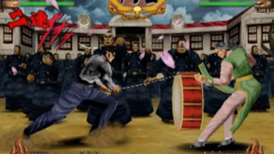 Sakigake!! Otokojuku is a 2D fighting game based on the manga series. Fighters are cel-shaded and colored with bright colors for a distinctive look. The fighting is presented on a 2D plane and hearkens back to old school fighting games where the camera pulls in when the combatants are close and out when they're far apart. Backgrounds are well done including one where a troupe of yankii gangsters are apparently punching the air and another where seated monks sit forlornly in the background.