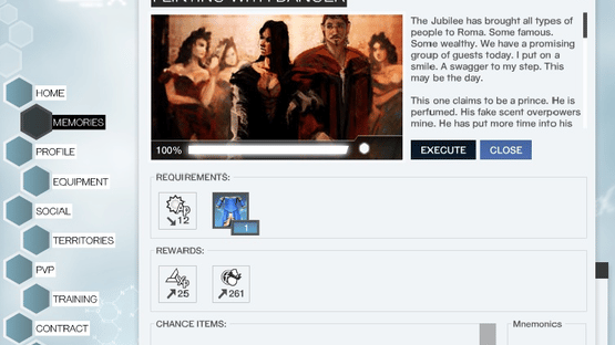 Assassin's Creed: Project Legacy was a Facebook game, which was first made available on 30 September 2010 with the "Italian Wars" memory set. In it, players were recruits for Abstergo Industries' Project Legacy, who relived the genetic memories of other individuals through a machine known as the DDS (Data Dump Scanner). Presumably, the DDS was similar to an Animus, but could allow a person to relive the memory of someone who was not their ancestor. In all, there were three memory sets available: "Italian Wars", "Rome" (released 15 November 2010) and "Holidays" (released 22 December 2010). The fourth memory set, Divine Science ("released" 4 July 2011), was made available outside of the DDS by Erudito, though the DDS interface still mentioned that the pack was "coming soon." On 15 May 2013, Facebook removed the game because it no longer complied with their Terms of Service for Facebook applications, as it had not been updated recently. It is unknown if the game will return in the future.