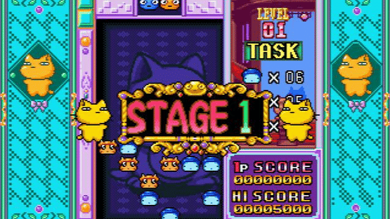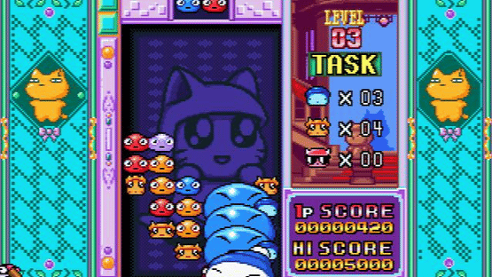 Hebereke's Popoitto is a Tetris variant. The goal in each level is to remove the blocks already on the playfield, representing characters from the franchise. Other blocks fall down from the top of the screen and have to be steered to the right place before touching the ground or another block. When four or more of the same blocks are together, they vanish. The catch of this variant is that the blocks which have to be removed move over the playfield. The player takes the role of the penguin Hebereke who wants to win a tournament against his friends.