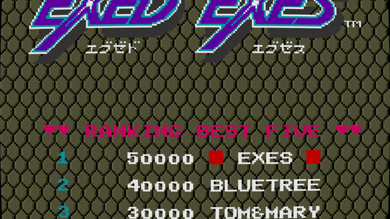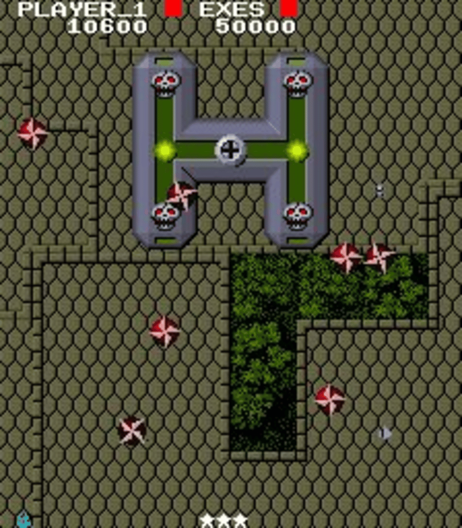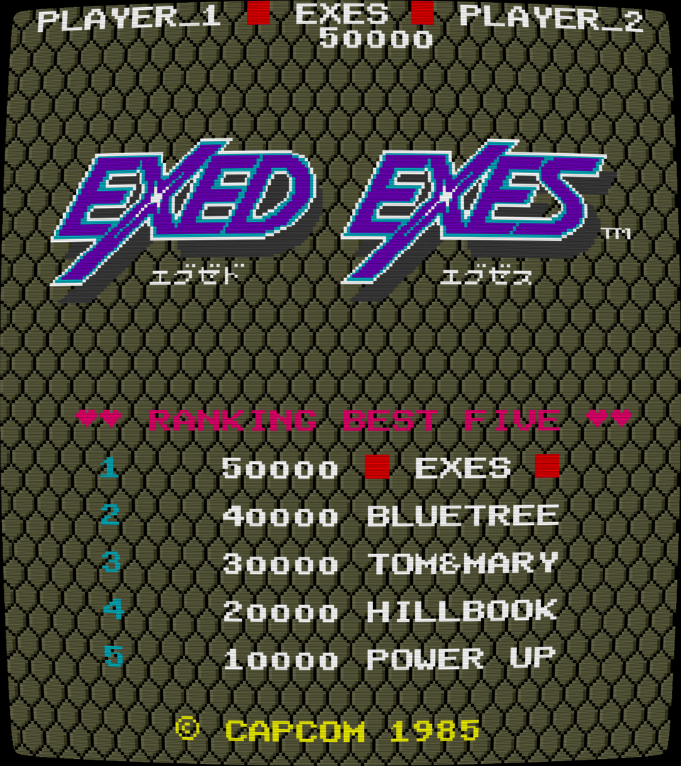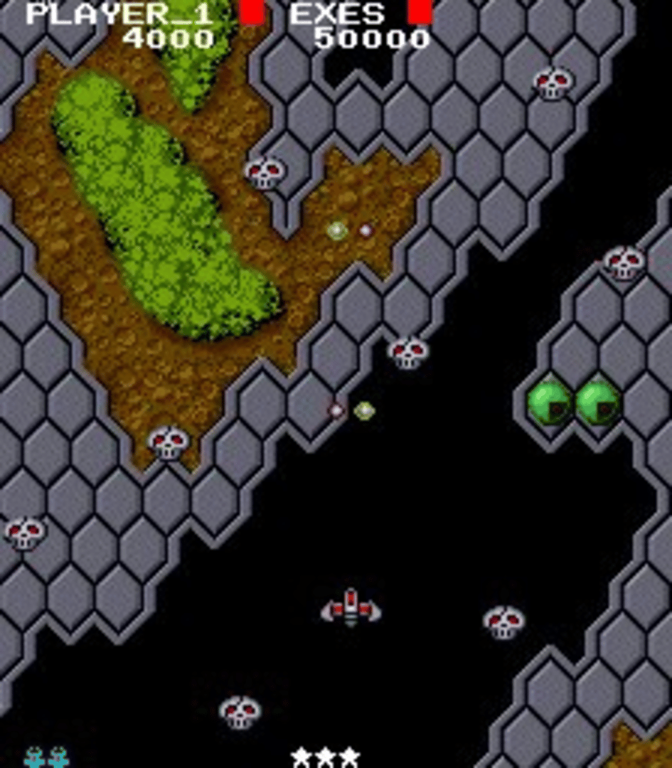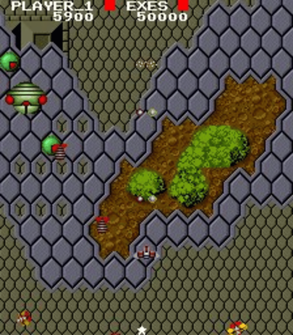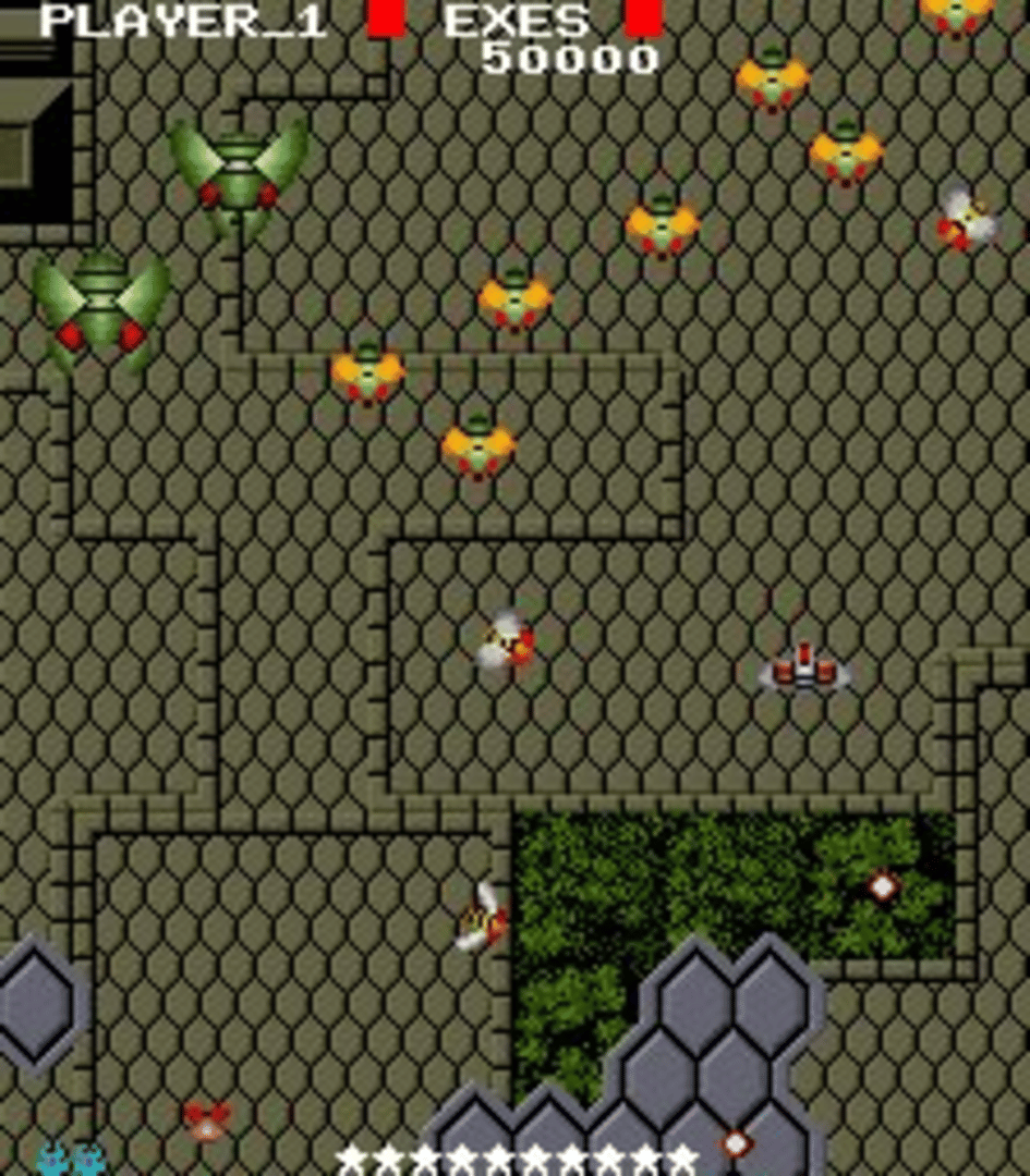 On a planet 6000 light-years from earth, there were creatures called Exes, which resemble large insects, that were used for industrial purposes. However, these creatures one day took to revolting against their creators. Two battle machines have been sent to fight against the Exes, known as Colonel and Sargent. The Exes are nearing completion of their secret weapon, Exed Exes, and they must be defeated before this is allowed to happen! Exed Exes is a basic vertical scrolling shooter; the game scrolls forward, and the player can maneuver their ship around the screen to shoot enemies and avoid attack. POW icons sometimes appear that can power up the ship or turn enemies into fruit that are worth extra points. The game can be played either solo or two-player cooperatively.